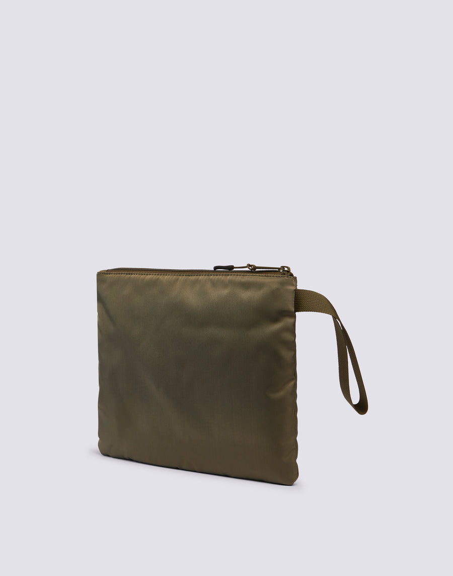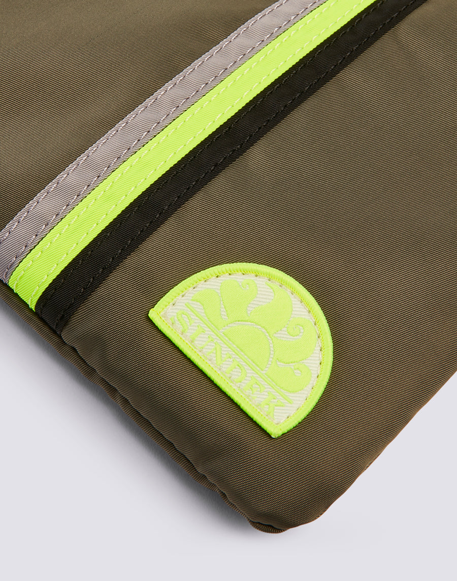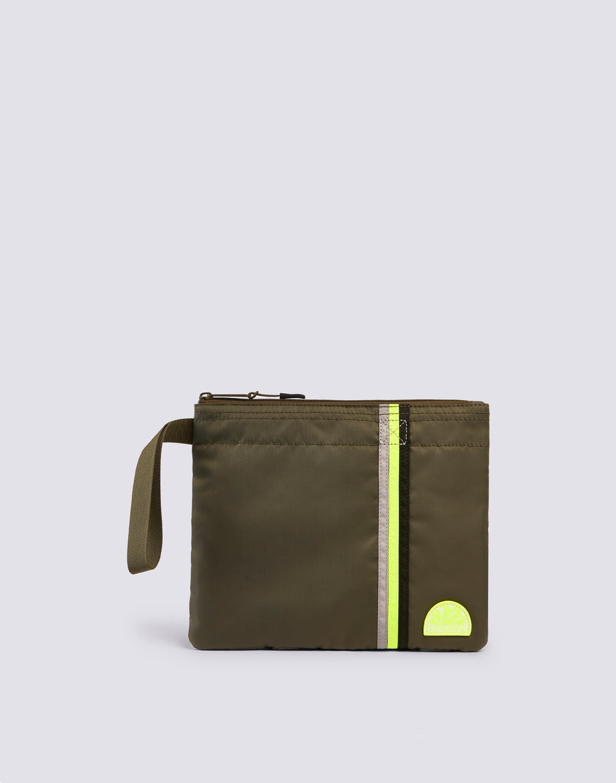 Pochette de playa ligera y forrada con el icónico detalle de las cintas tricolor para guardar y proteger los básicos que prefieres tener a mano. Perfecta para llevar en el bolso o sola gracias a la práctica correa de muñeca.