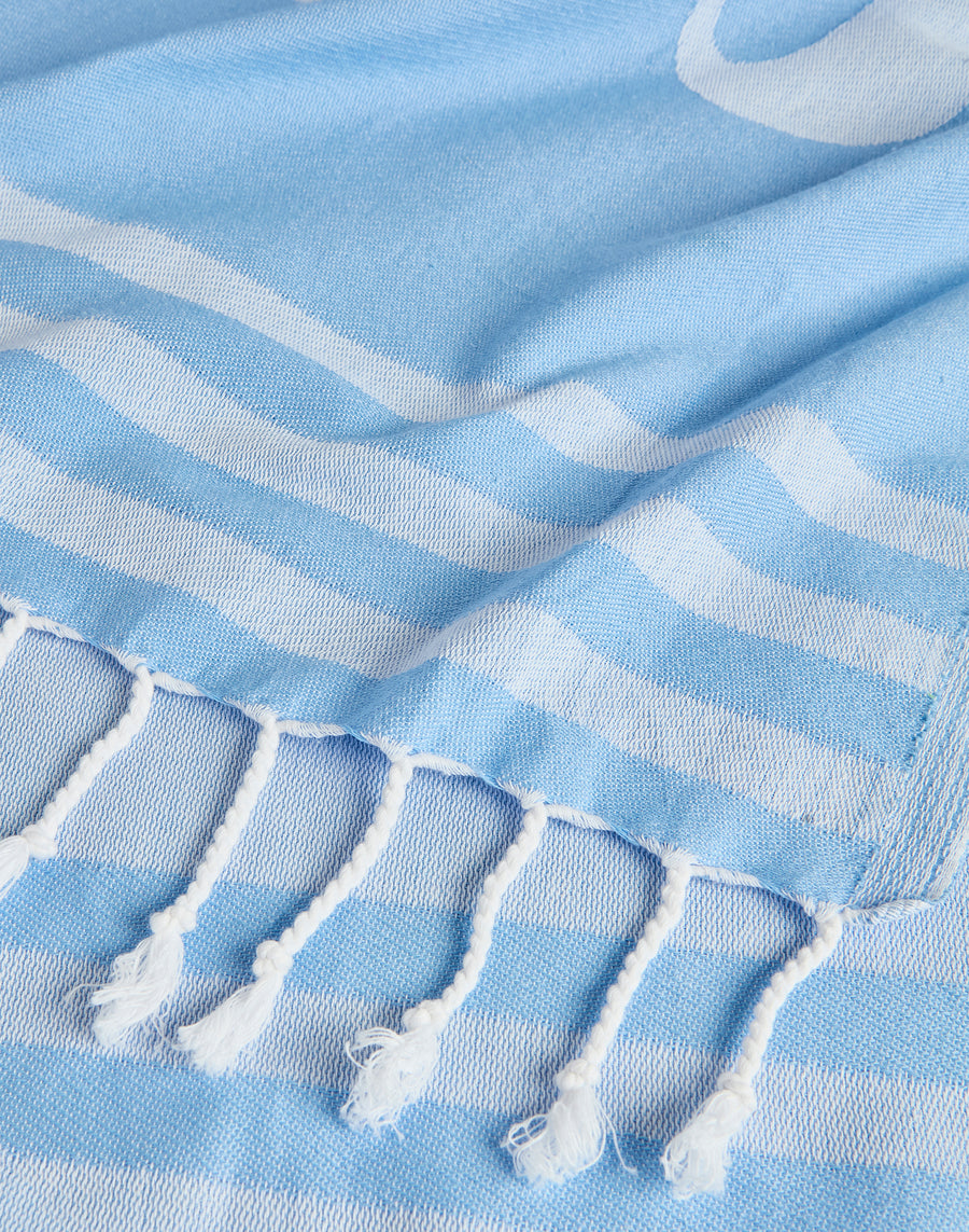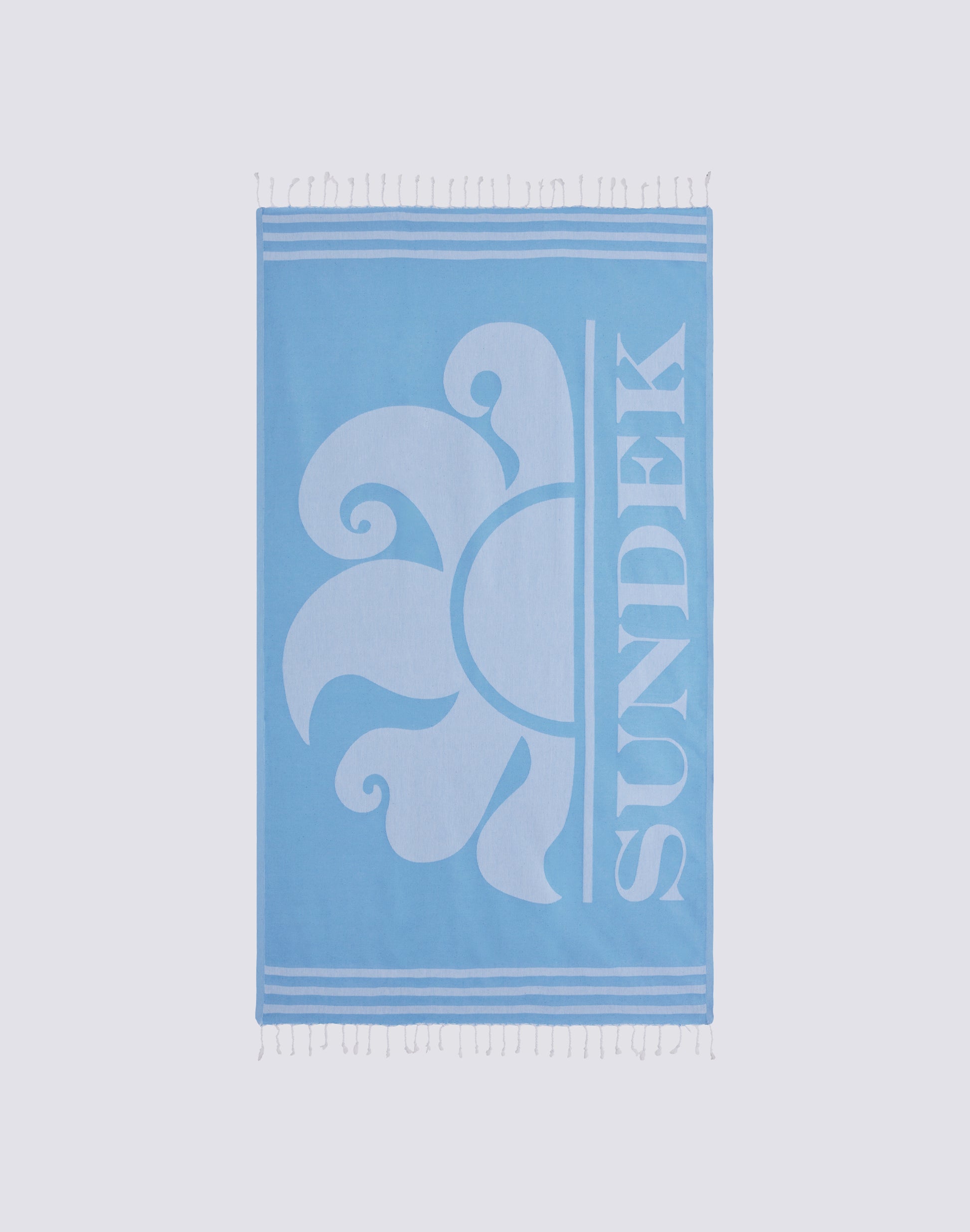 Toalla de playa tipo fouta de jacquard con maxilogotipo a contraste con rayas verticales y bajos tejidos con flecos. Largo: 100x170cm. Peso: 320 g.