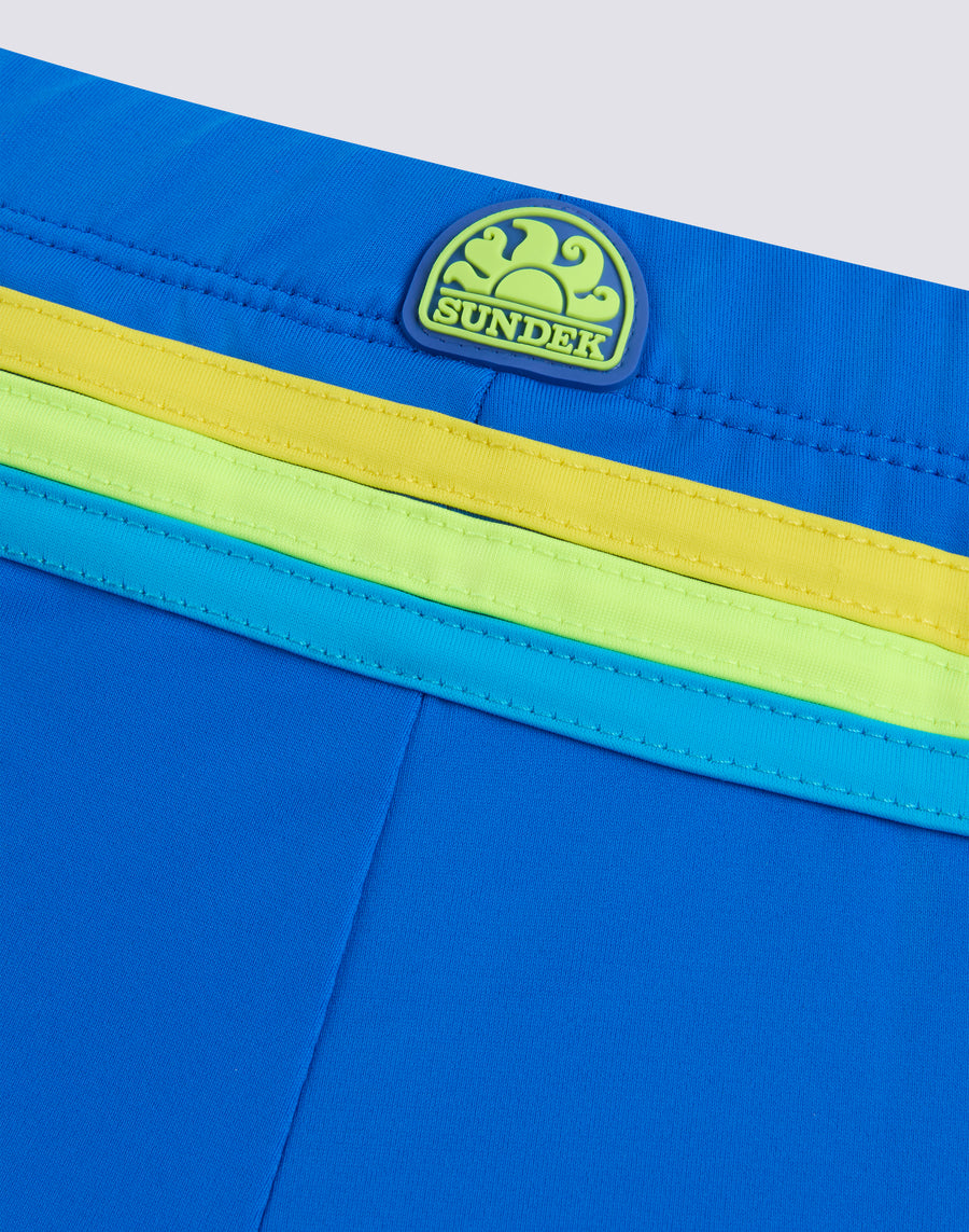 Los calzoncillos de playa para niños son todo color y sin olvidar el medio ambiente, porque están hechos de nailon regenerado ECONYL®. Cómodo gracias a la cintura elástica y al cordón ajustable, es el bañador que tu hijo podrá llevar fácilmente para jugar y nadar.