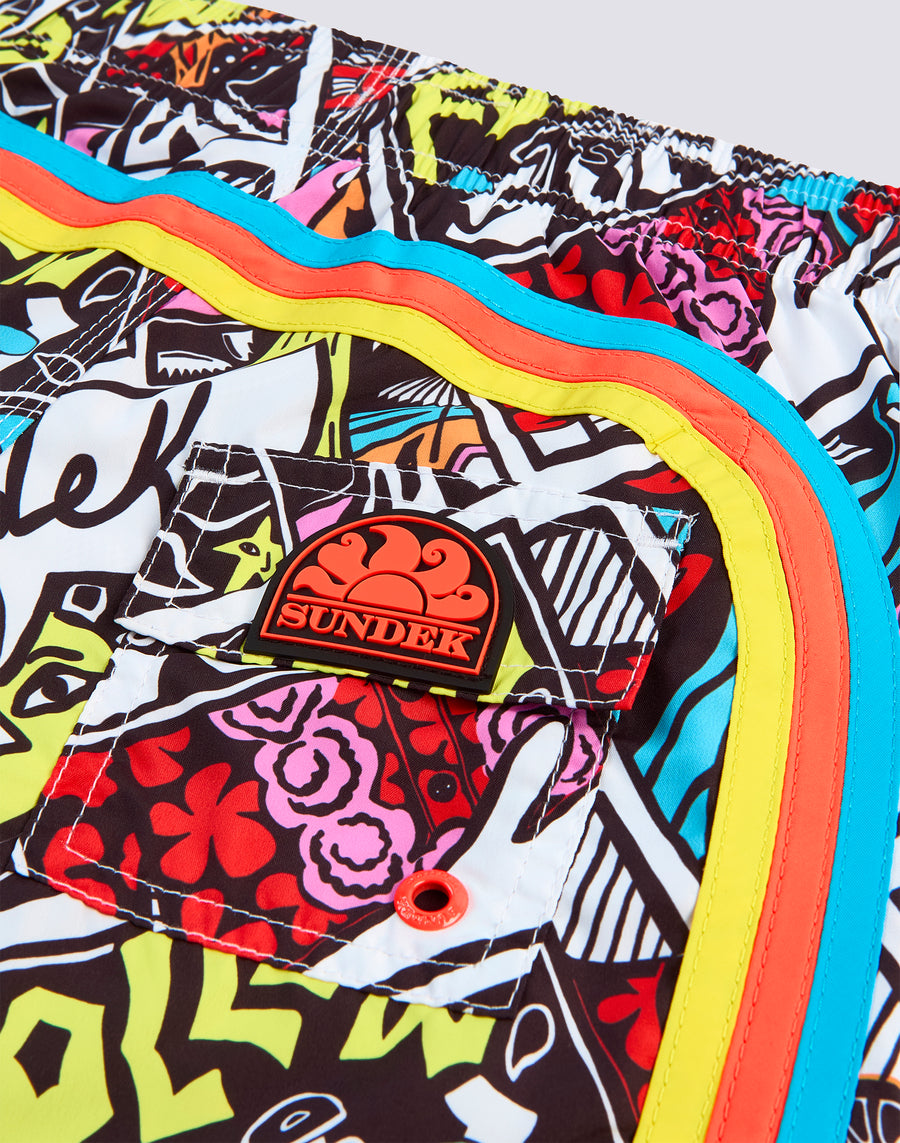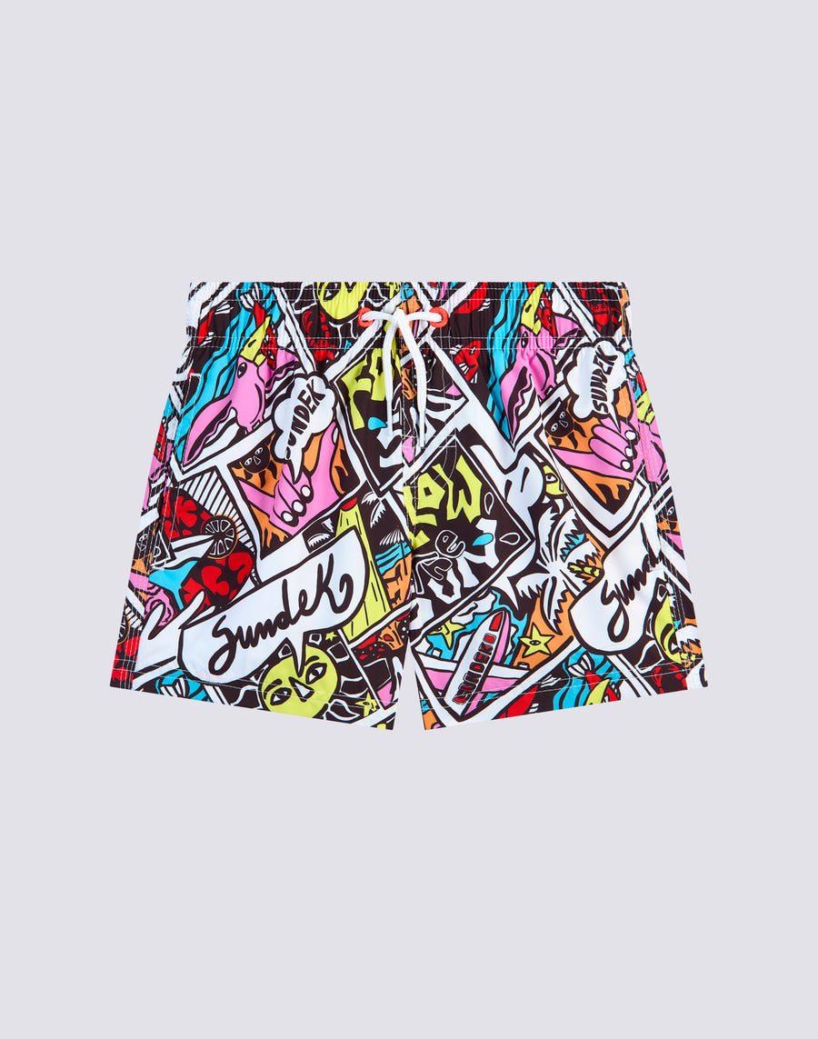 Bañador con cordón elástico en la cintura, en tejido ligero Repreve® reciclado a partir de botellas de plástico. Con estampado Fumetto y el tradicional arcoíris Sundek en la espalda. Largo exterior del muslo 10,25"/26 cm (en talla 6 años).