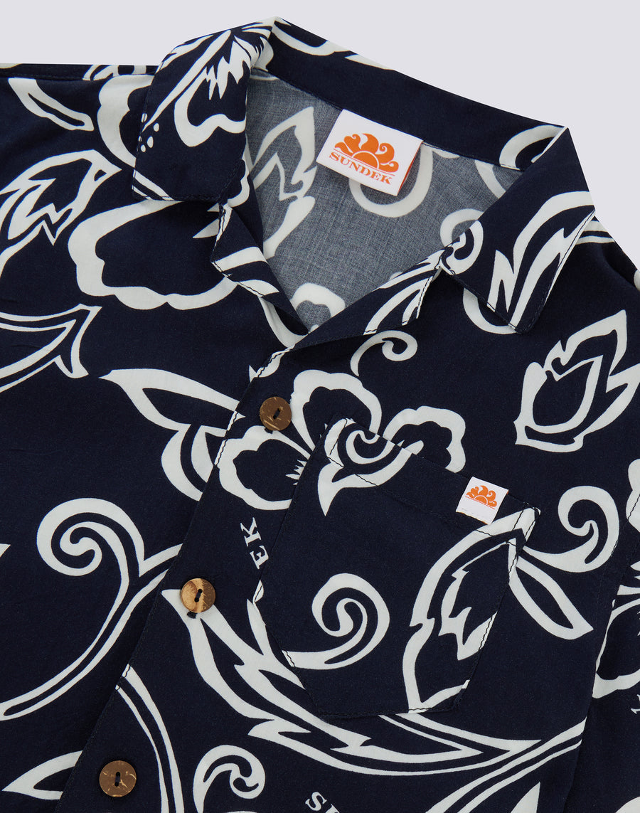 Sumérgete en los estampados de Sundek. Camisa de niño de manga corta modelo bowling con estampado floral. Confeccionada en viscosa popelín, fresca y cómoda, ¡para jugar y correr en busca de aventuras!