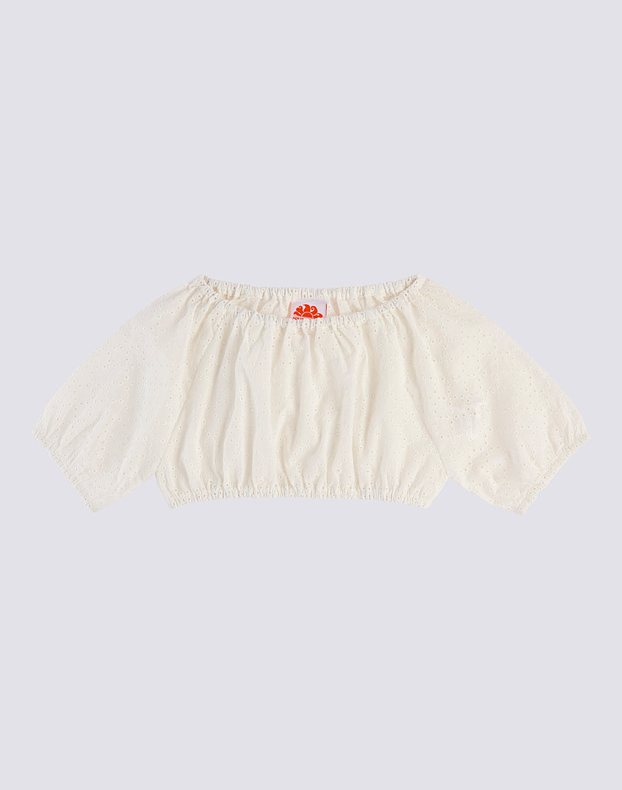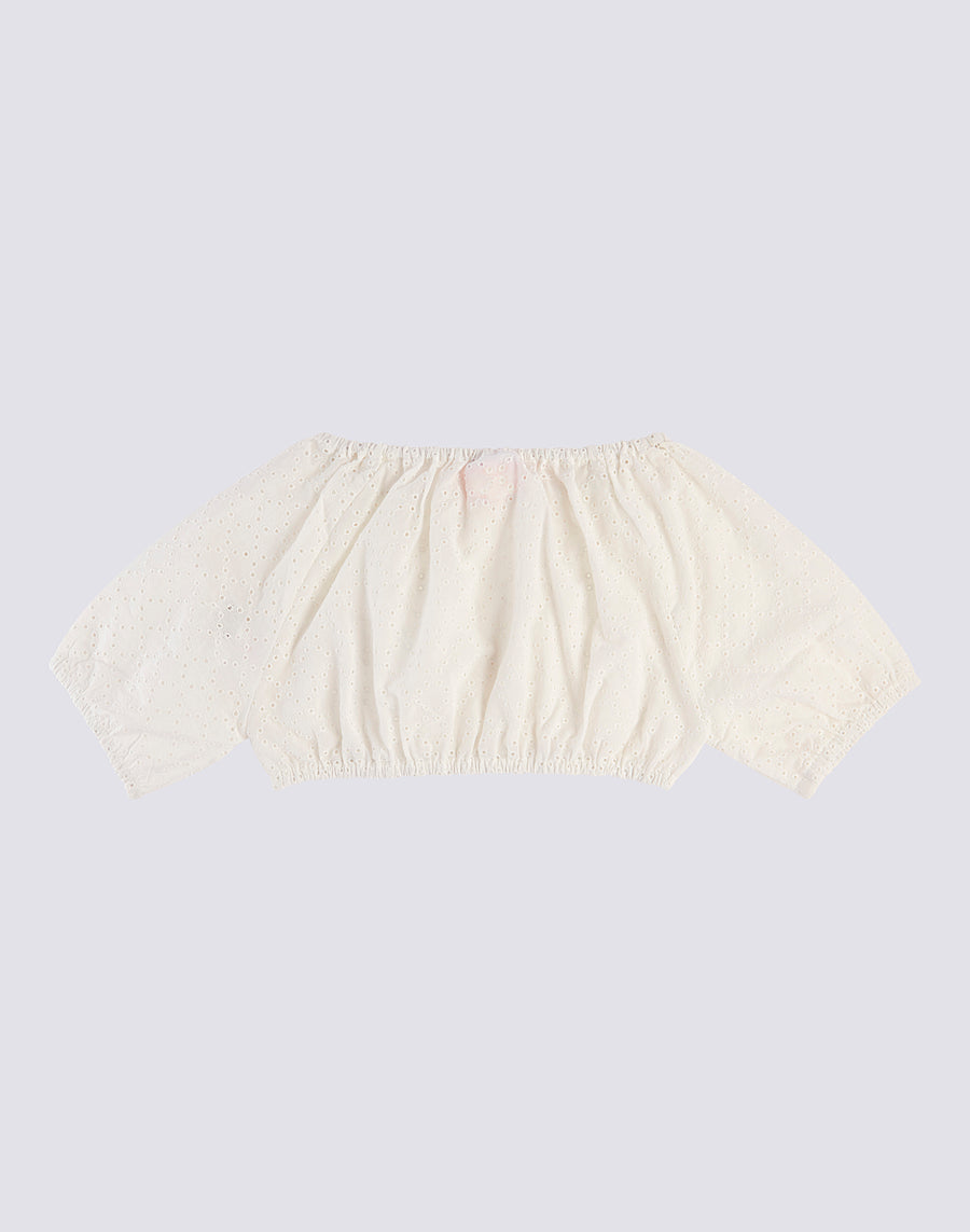 Refinada blusa de niña de corte recortado en algodón sangallo con mangas anchas. Para ocasiones elegantes, ideal con pantalón o falda.