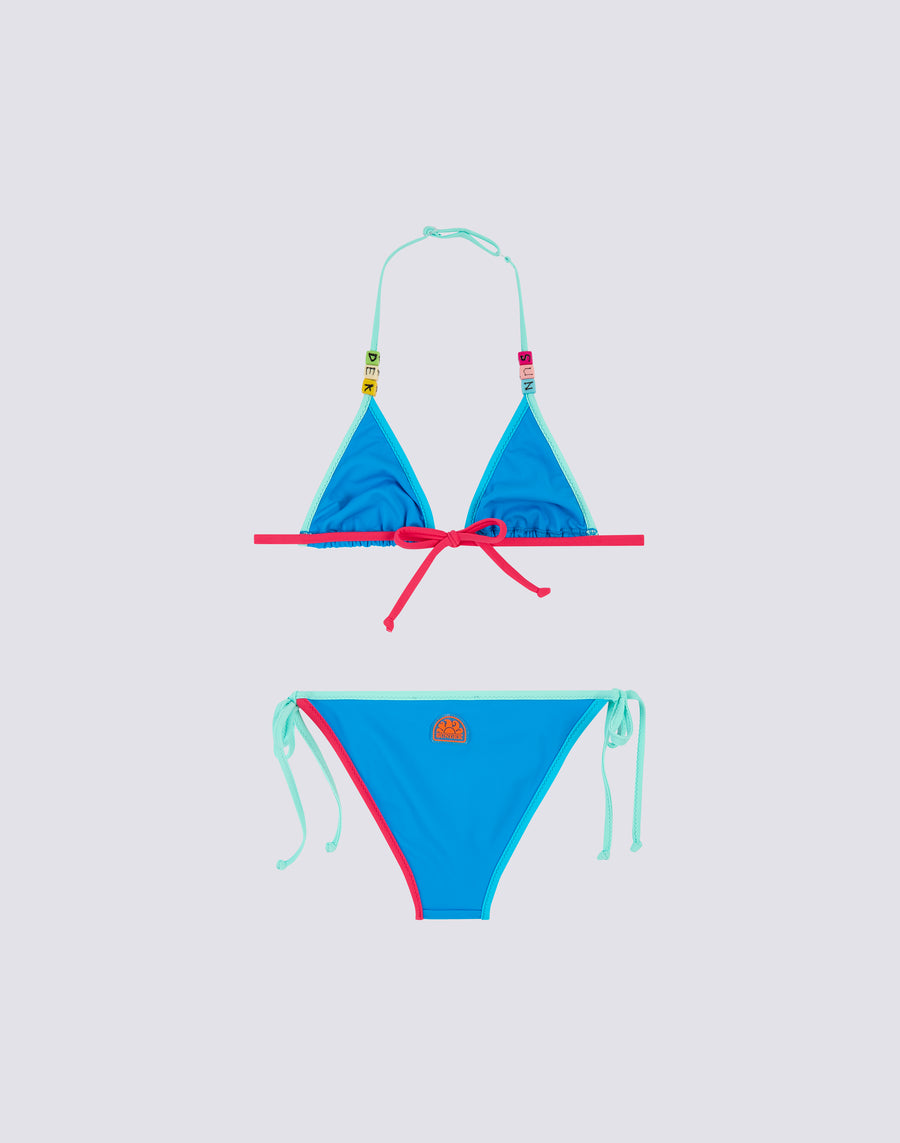 Bikini de playa para niña con top de triángulo ajustable con lazos en la nuca adornado con cuentas multicolores y ribetes en contraste. El bañador de dos piezas está confeccionado con el cómodo y duradero tejido VITA by Carvico, resistente al cloro y a los protectores solares.
