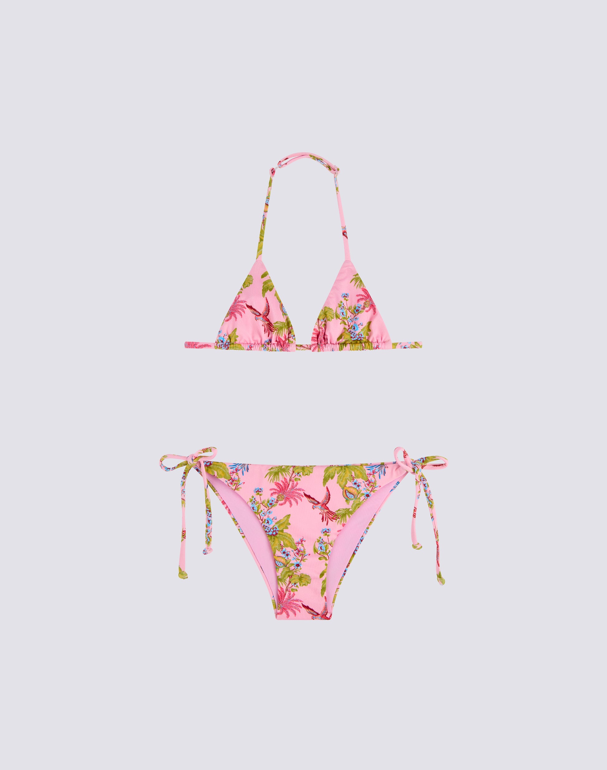 Mini bikini para niña con estampado Sweet Parrot, compuesto por un top triangular y braguita con tirantes ajustables.