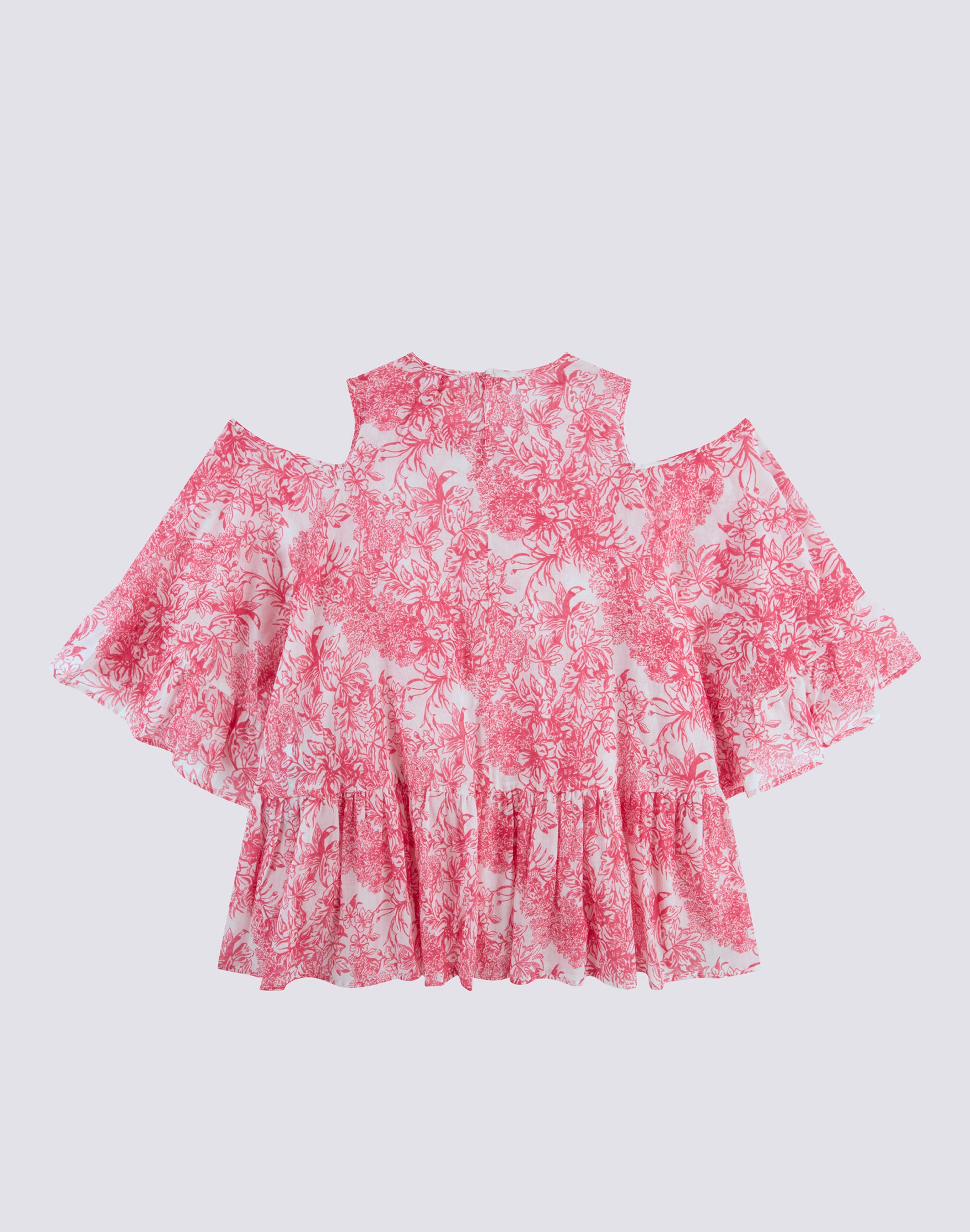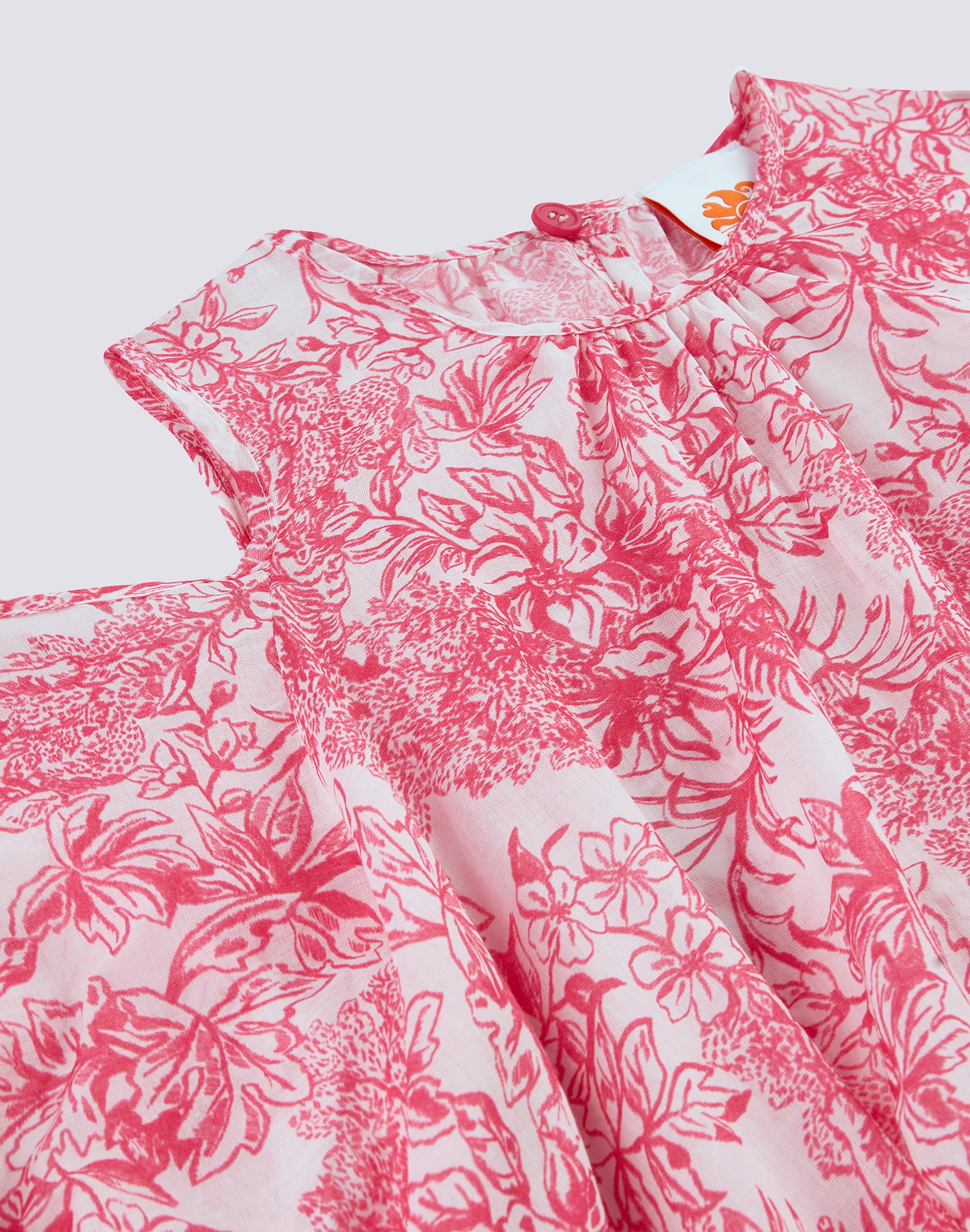 Vestido corto de niña con elegante estampado Fleur de Joie. Con manga larga y abertura en los hombros, es la prenda ideal para lucir en ocasiones especiales, quizá coordinado con el mismo modelo en versión adulta.