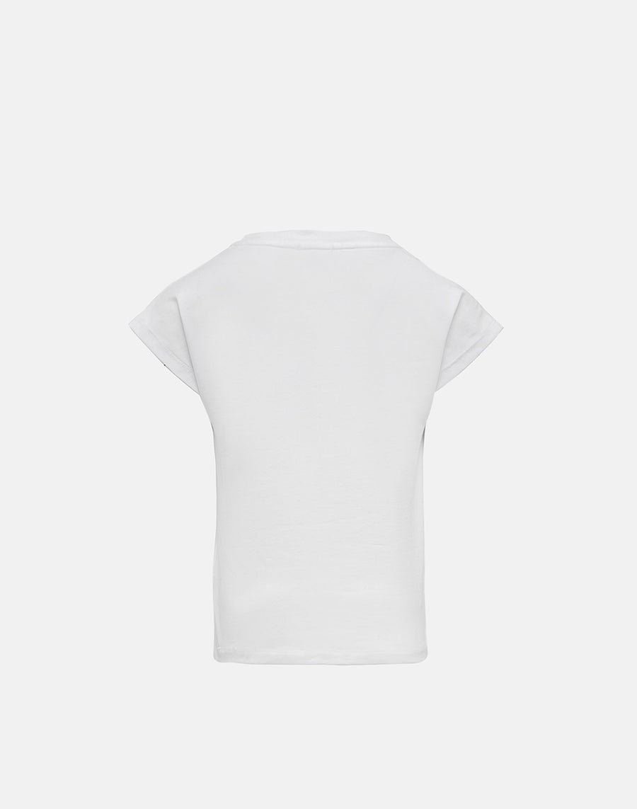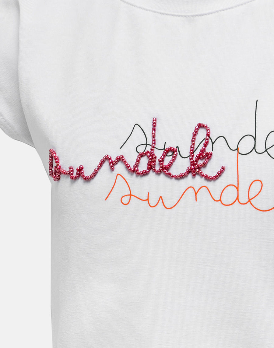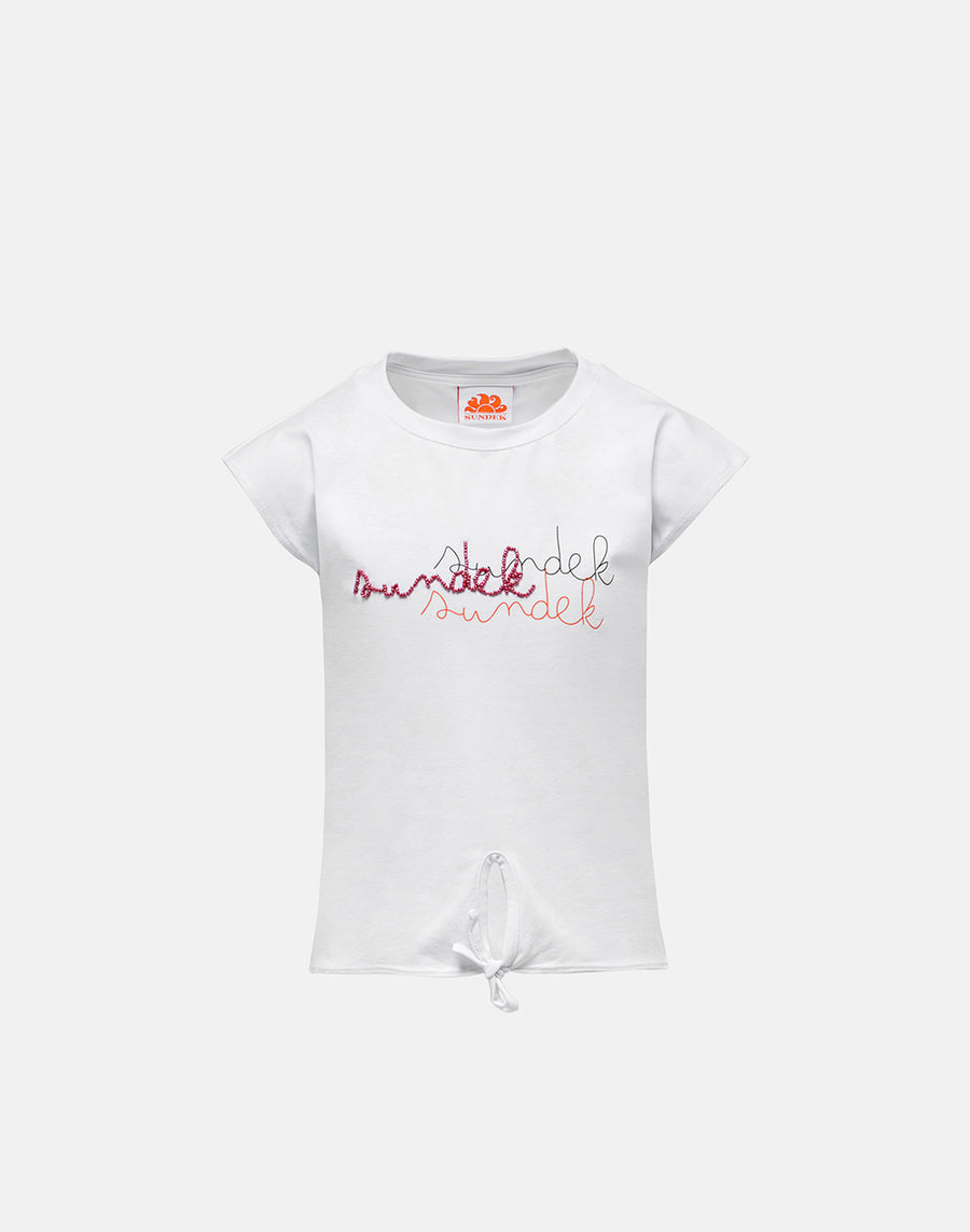 Una camiseta divertida y versátil para llevar todo el verano con muchas prendas diferentes: sin mangas, de corte cropped y con nudo central y logotipo Sundek central bordado con cuentas.
