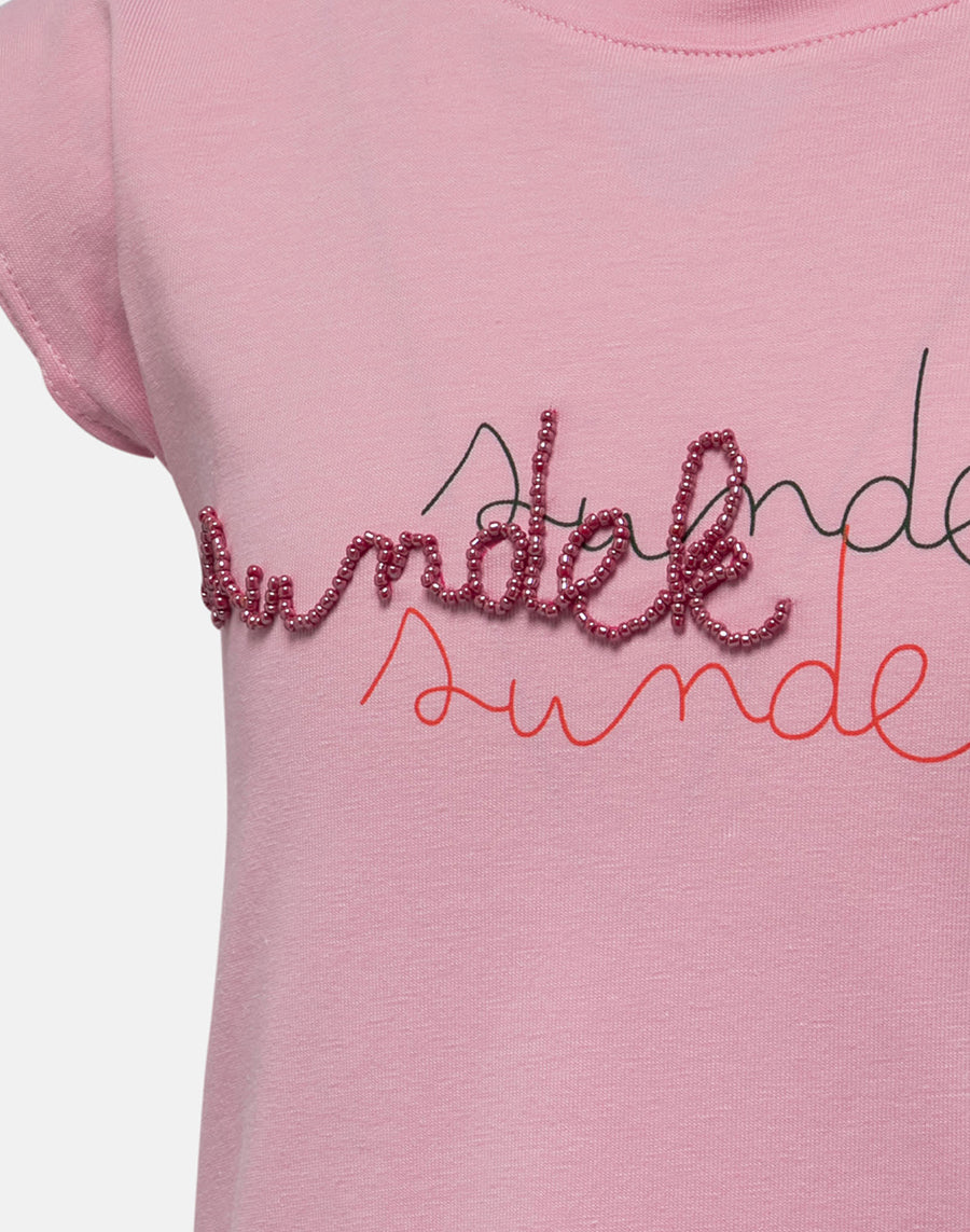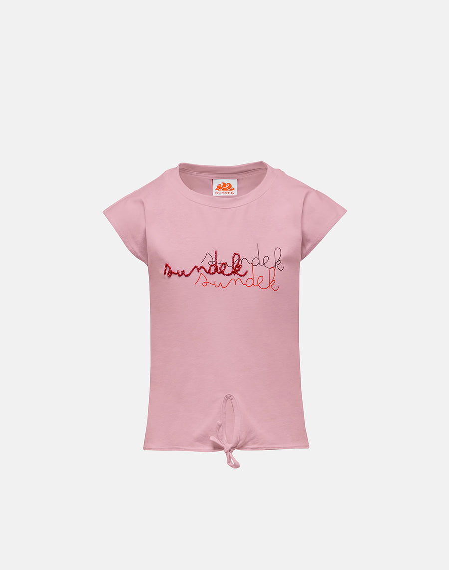 Una camiseta divertida y versátil para llevar todo el verano con muchas prendas diferentes: sin mangas, de corte cropped y con nudo central y logotipo Sundek central bordado con cuentas.