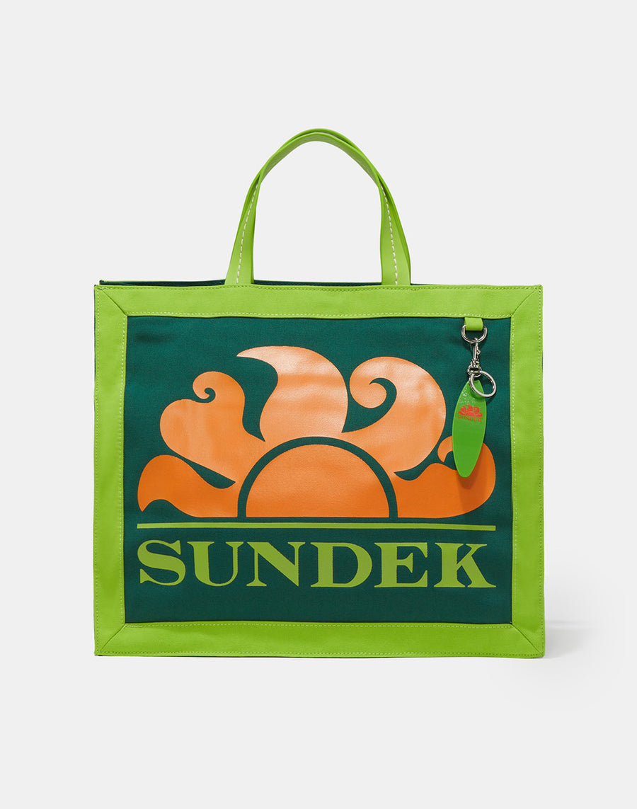 Bolsa de playa de mano de lona con logotipo estampado. Amplia y espaciosa con bolsillo interior y cierre de cremallera. Charm con la forma característica de una tabla de surf