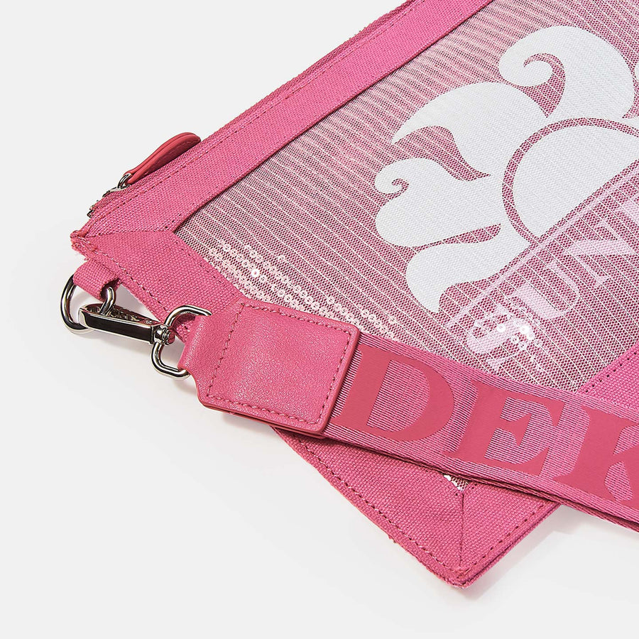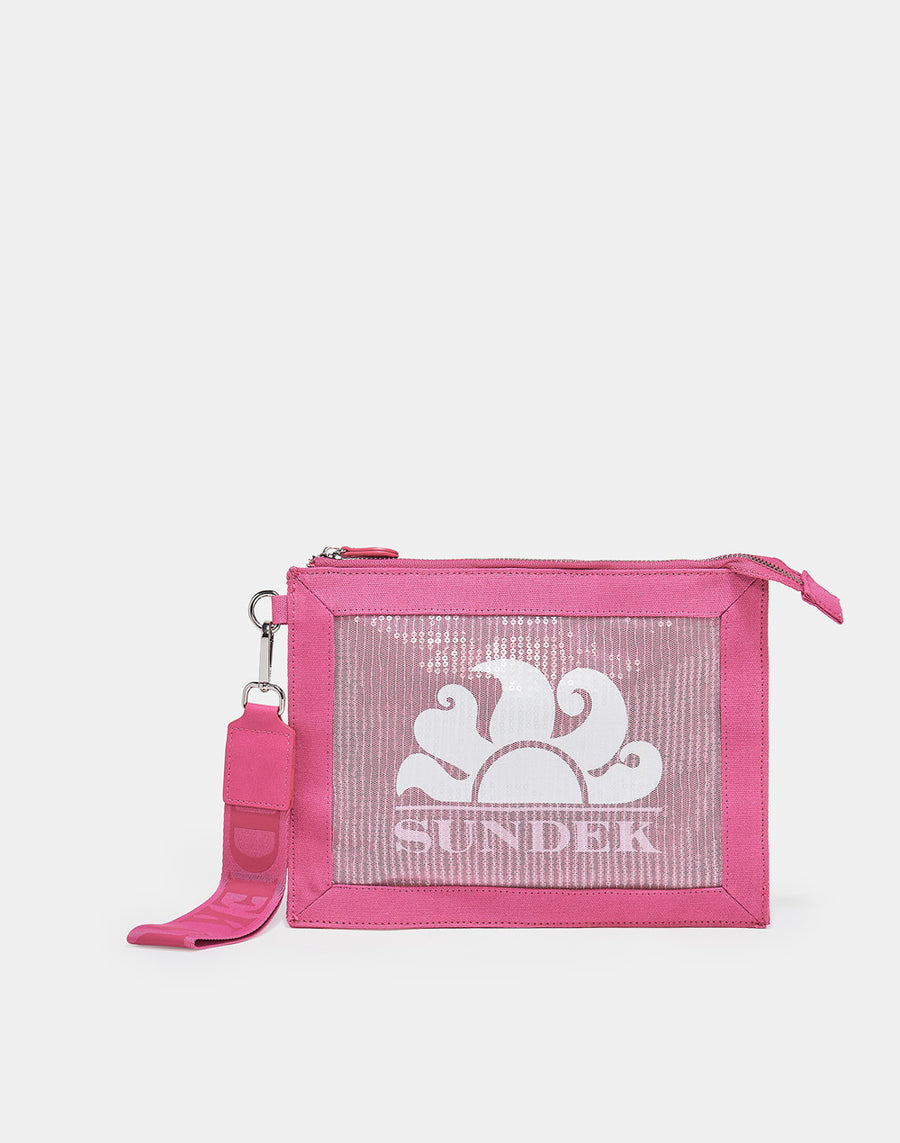 Clutch de malla con lentejuelas y logotipo Sundek bordado. Perfecto tanto como neceser como para usar como pochette. Correa con logotipo Sundek extraíble