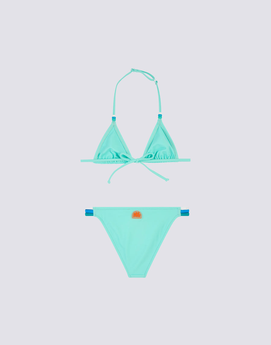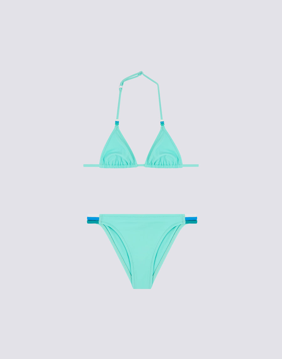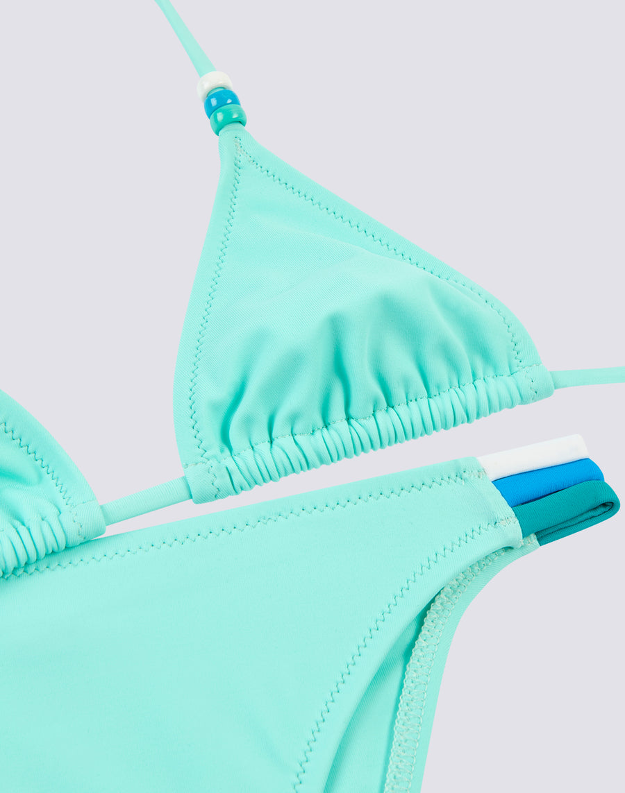 Bikini de baño para niña con parte de arriba de triángulo ajustable con lazos en la nuca adornados con abalorios tricolores. Los tres colores de las cuentas se repiten en el detalle tricolor del lateral de la braguita del bikini. El traje de baño de dos piezas está confeccionado con tejido VITA de Carvico, que es cómodo, resistente y no teme al cloro ni a las cremas solares.
