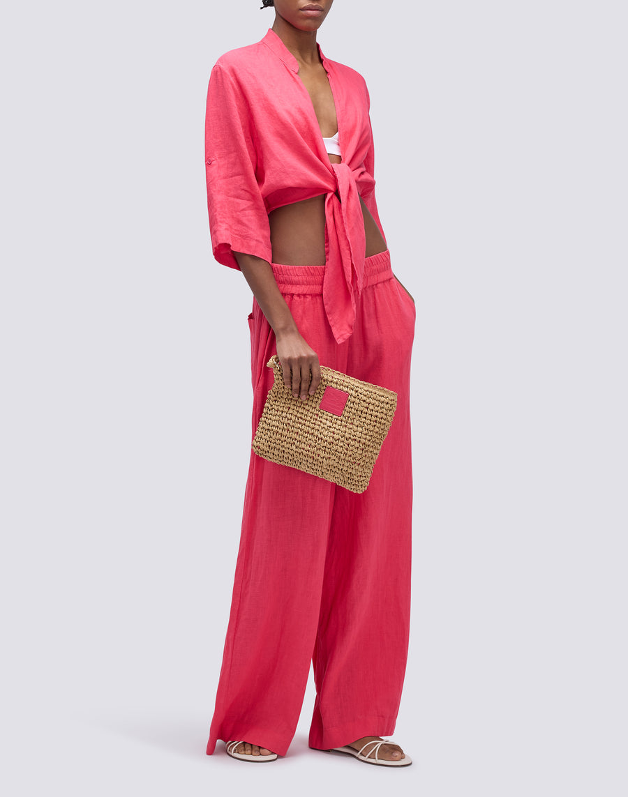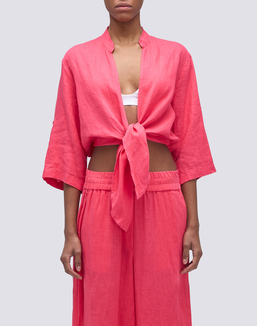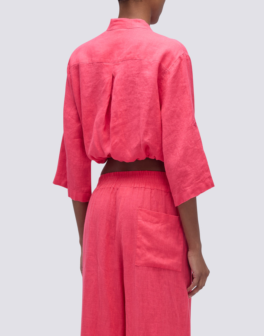 Camisa de lino teñido en prenda con corte cropped y cierre de nudo, mangas fruncidas y cuello mao. Fresca y desenfadada, para looks informales y desenfadados.