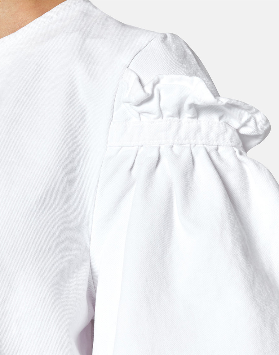 Blusa de bull de algodón con corte evasé, caracterizada por la manga corta acampanada con volantes, realizada en bull de algodón suave y cómodo.