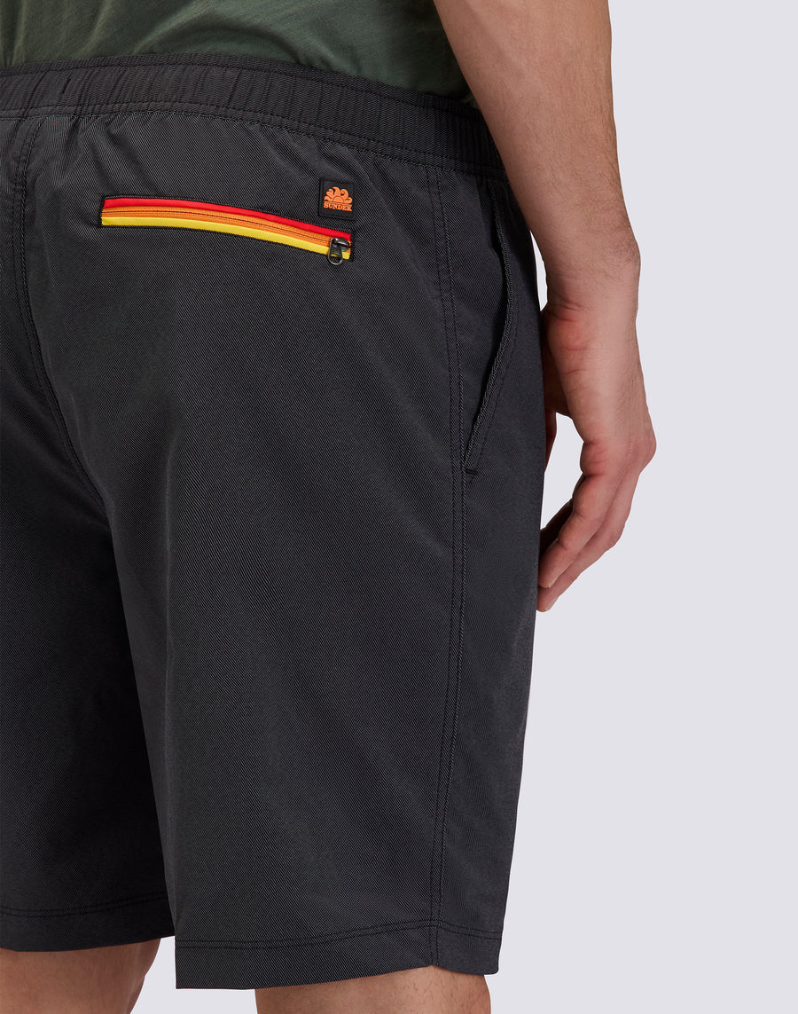 66% POLIAMIDA 29% POLIÉSTER 5% ELASTÁN - SECADO RÁPIDO Tejido de mezcla de nailon y poliéster ligero, de secado rápido, repelente al agua, elástico y muy cómodo. Gracias a sus características técnicas, es adecuado para su uso tanto dentro como fuera del agua.