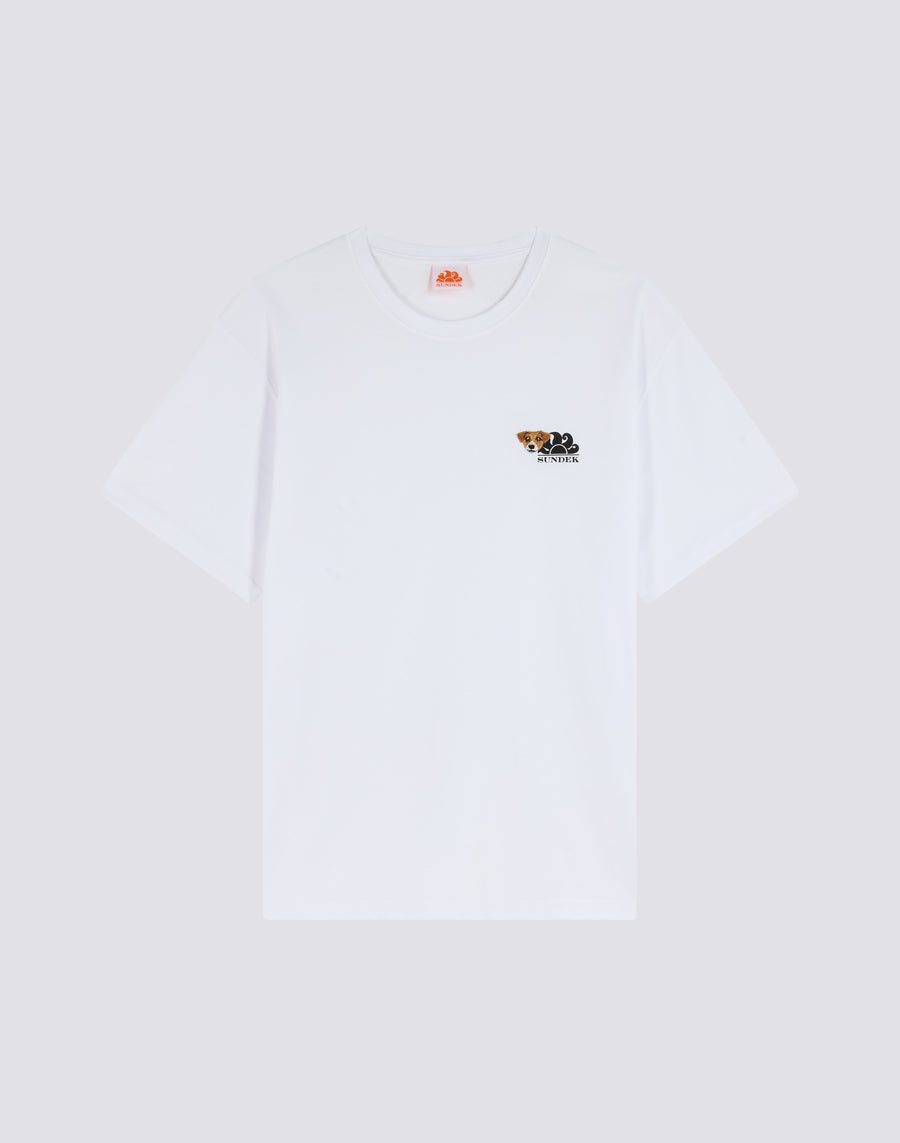 Camiseta de algodón de la exclusiva cápsula de la Fundación Sundek & Pelo. Este modelo representa a un simpático Jack Russell, combinando la pasión por el mar con el cariño por nuestros amigos los animales.
