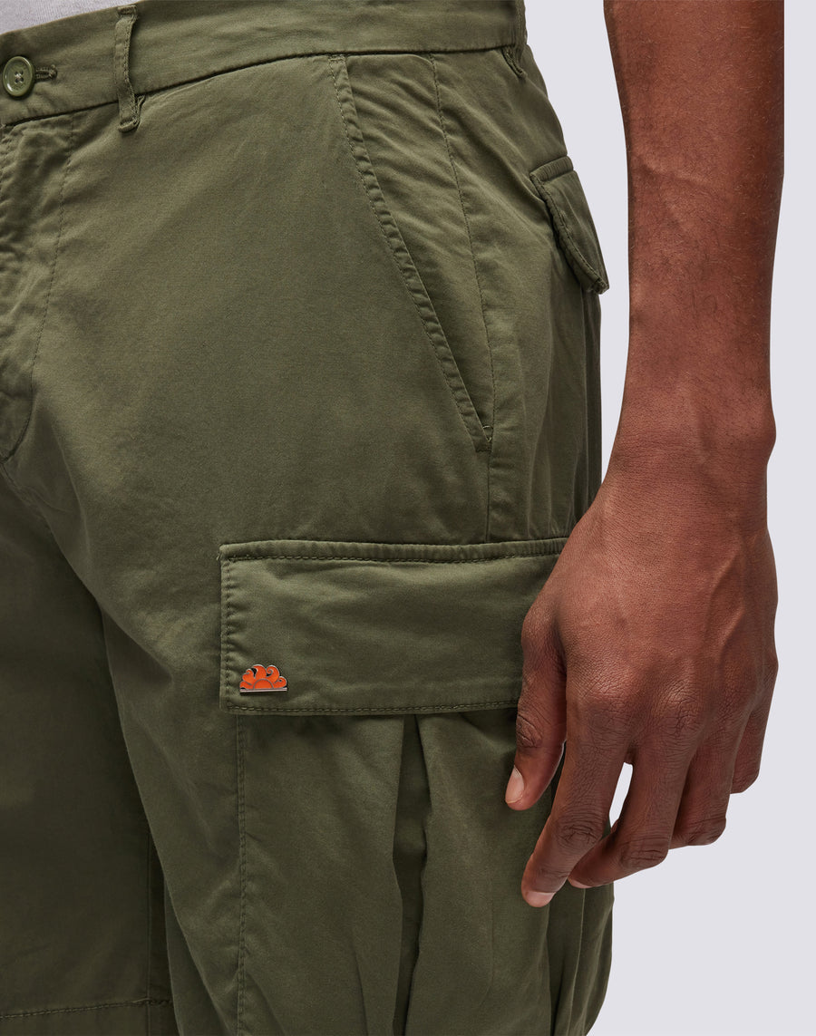 Walkshort estilo cargo de sarga de algodón con cierre de botón y trabillas en la cintura. Destaca el detalle del arco iris en la parte delantera, a la altura del bolsillo lateral derecho.