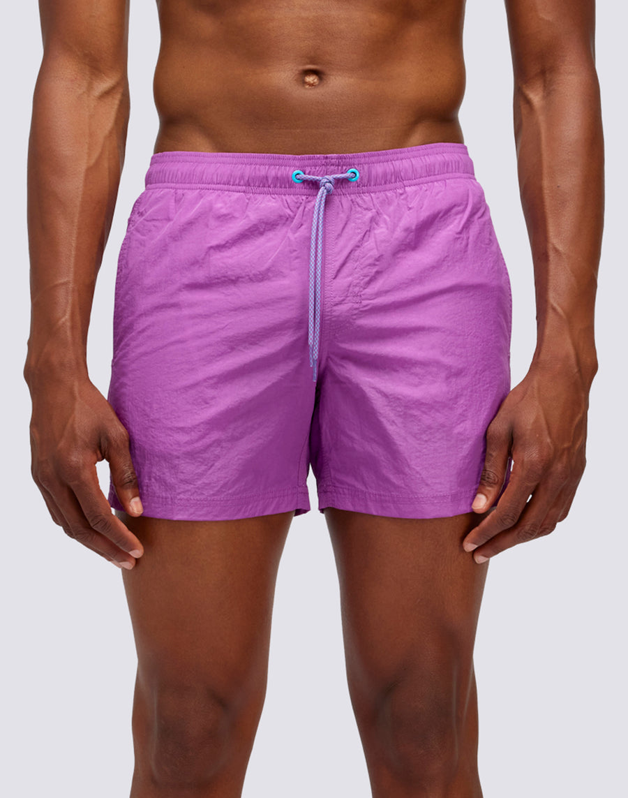 Disfraz de hombre corto de color corto con colores brillantes. Ligero, resistente, se seca muy rápidamente y está hecho de nylon de tafetán, la icónica tela del domingo. Tiene nuestras costuras clásicas de tres agujas que aumentan la resistencia con el tiempo y nuestro arco iris en la parte posterior.