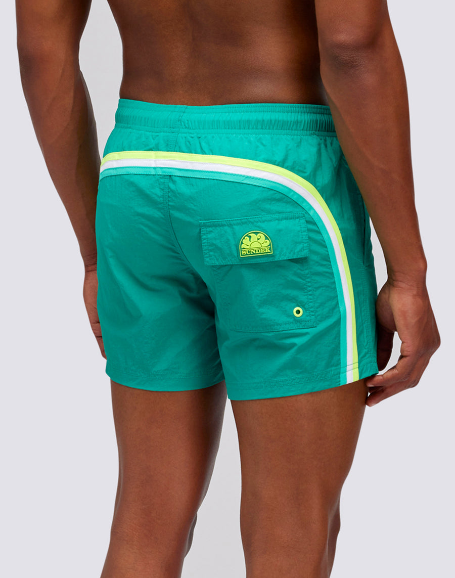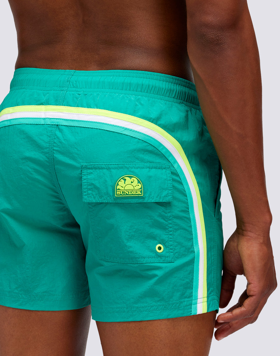 Bañador corto de hombre de colores vivos. Ligero, duradero, de secado rápido y confeccionado en tafetán de nailon, el tejido icónico de Sundek. Tiene nuestras clásicas costuras a tres agujas para mayor durabilidad y nuestro arco iris en la espalda.