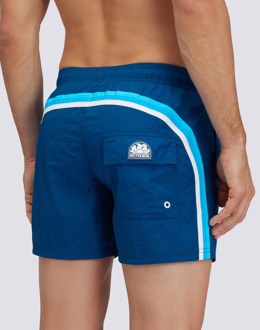 Bañador corto de hombre de colores vivos. Ligero, duradero, de secado rápido y confeccionado en tafetán de nailon, el tejido icónico de Sundek. Tiene nuestras clásicas costuras a tres agujas para mayor durabilidad y nuestro arco iris en la espalda.