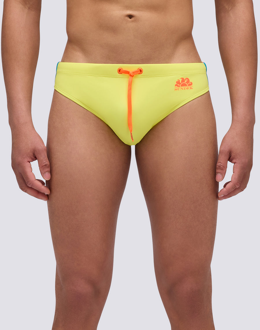 Braguita de hombre en color liso y cintura ajustable. Bañador monocromático con cordón y tres bandas laterales de colores en contraste para un look decidido y funcional. Se seca rápidamente y te aporta comodidad y resistencia dentro y fuera del agua: úsalo para nadar y entrenar y cuando descanses y tomes el sol.