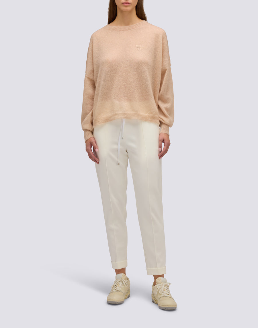 Pantalones largos de mujer en punto Milan con cordón ajustable en la cintura, bolsillos laterales, pinza central delantera y bajos fijos con vuelta. Corte pitillo. Ajuste slim.