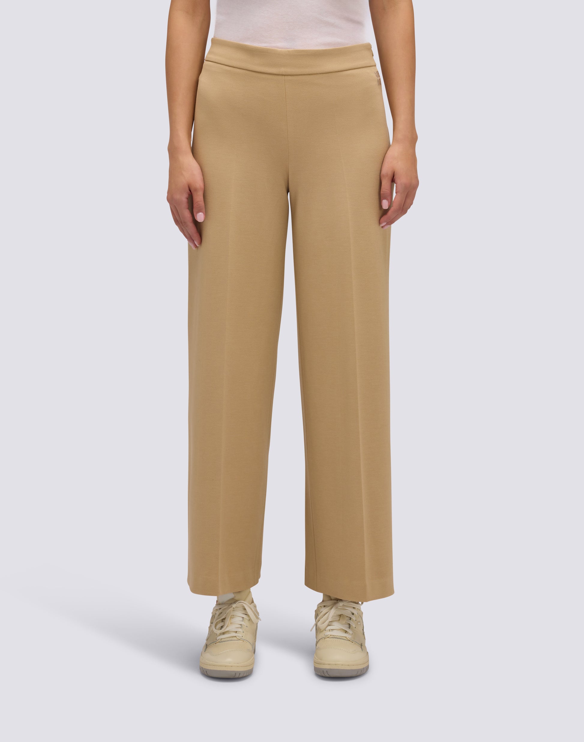 Pantalones largos de mujer en sarga con cintura semi-elástica, frente limpio y cremallera lateral oculta. Silueta fluida y pierna recta.