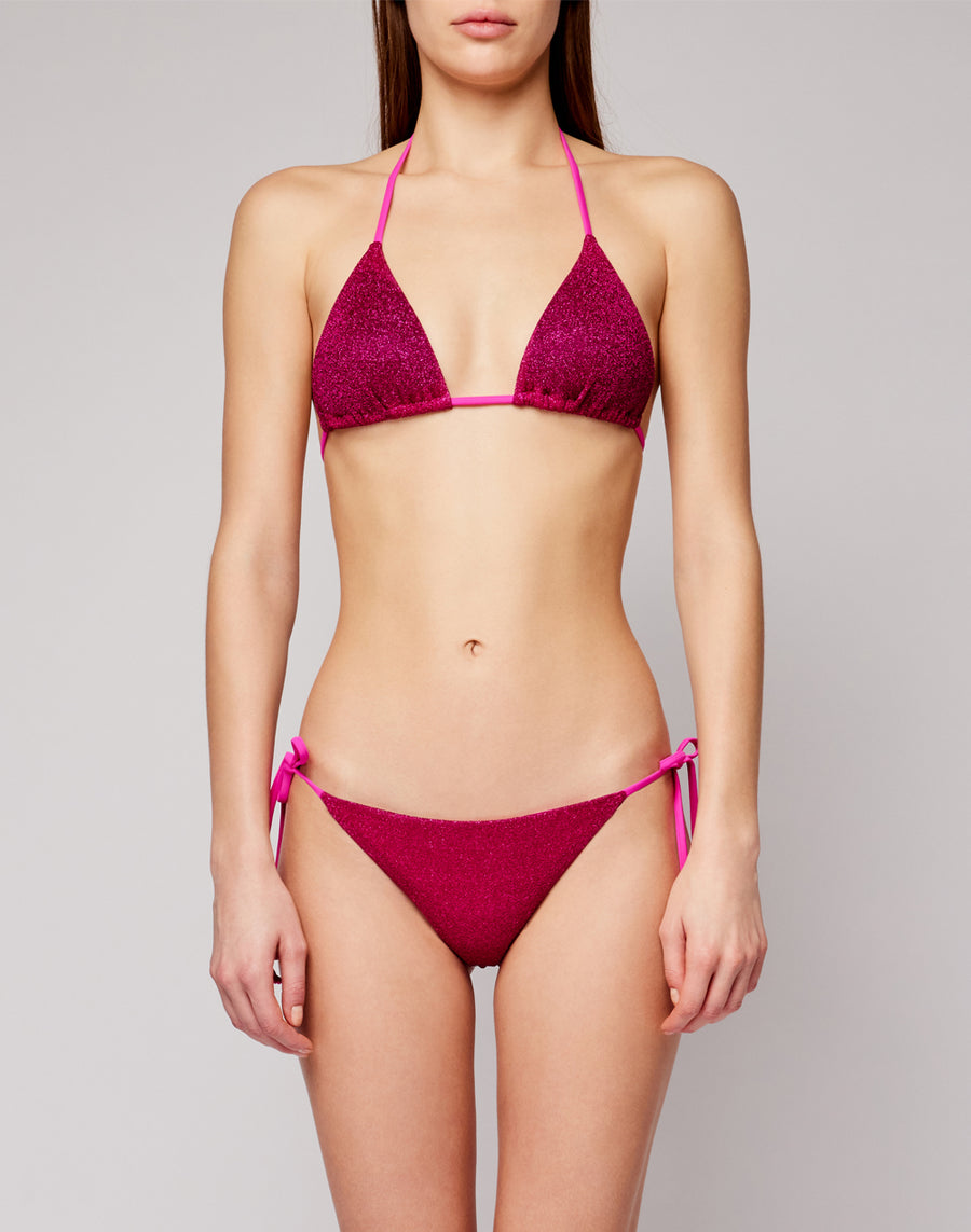 El brillo del lúrex es el detalle de este top de triángulo que se puede combinar con la braguita a juego para un conjunto ultra chic. También es perfecto para tus looks de noche en verano, mostrándolo debajo de blusas y tops ligeros.