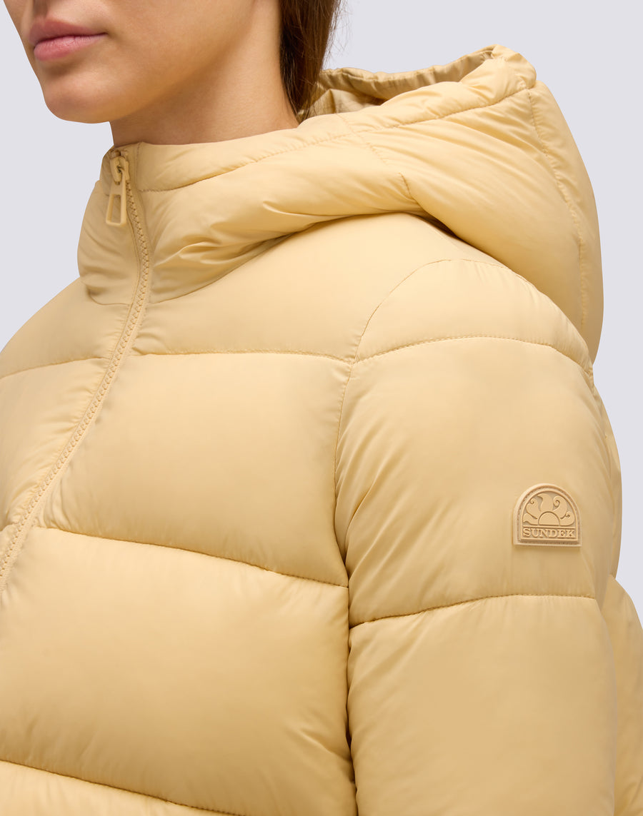 Chaqueta corta de plumón para mujer con capucha, confeccionada en tejido de nailon opaco superligero. La prenda está acolchada con amplios canales horizontales y rellena con una innovadora fibra sintética Repreve, que contribuye a conferirle ligereza y, al mismo tiempo, protección contra el frío. La chaqueta cuenta con una cremallera moldeada a presión a tono que cierra la parte delantera, mientras que los bolsillos tienen cremalleras invisibles. La capucha y el bajo de la prenda son ajustables con cordón y bloqueador. Los guantes desmontables están forrados de forro polar y completan la prenda. Corte trapecio, que realza la figura; grado de calor medio/alto.