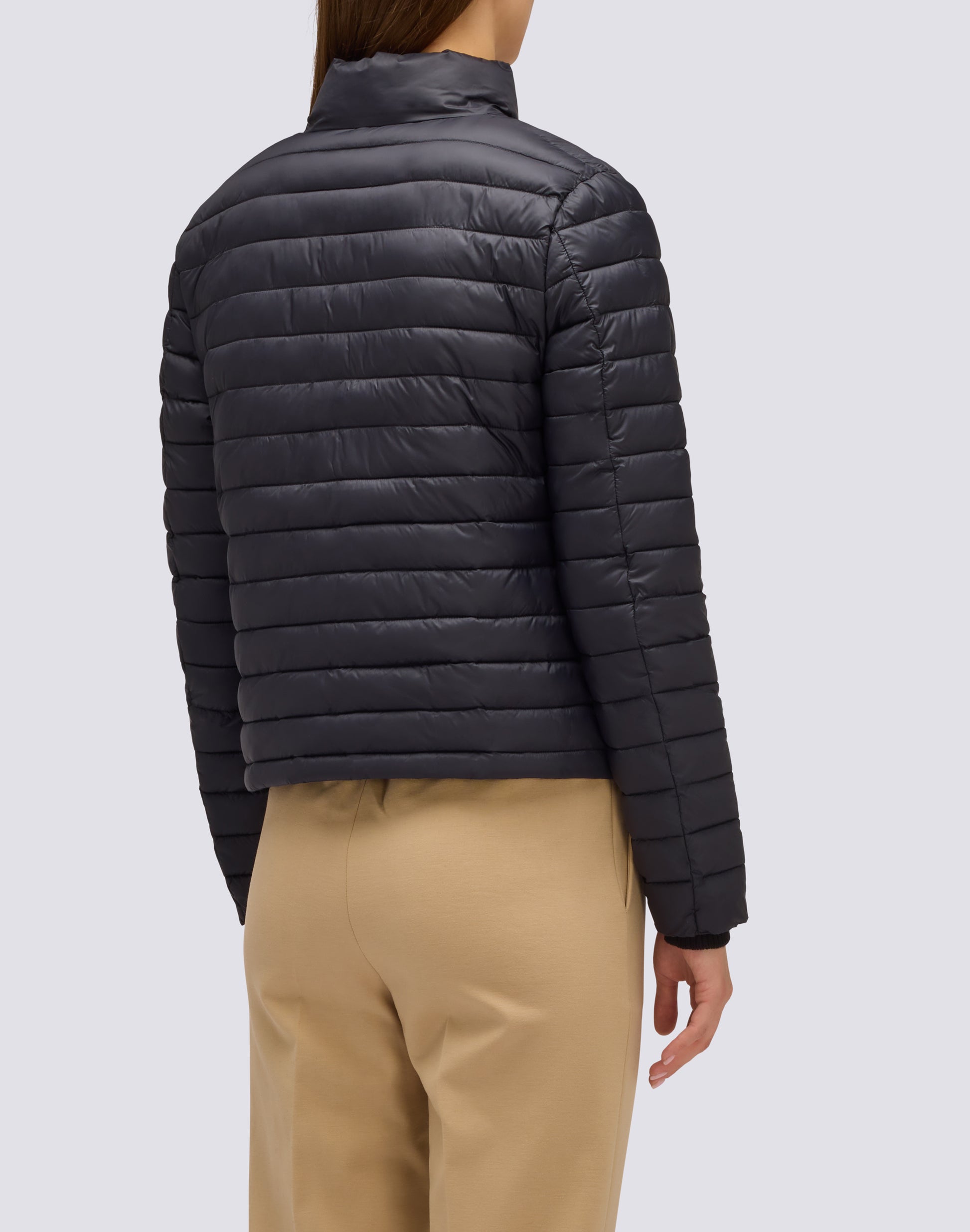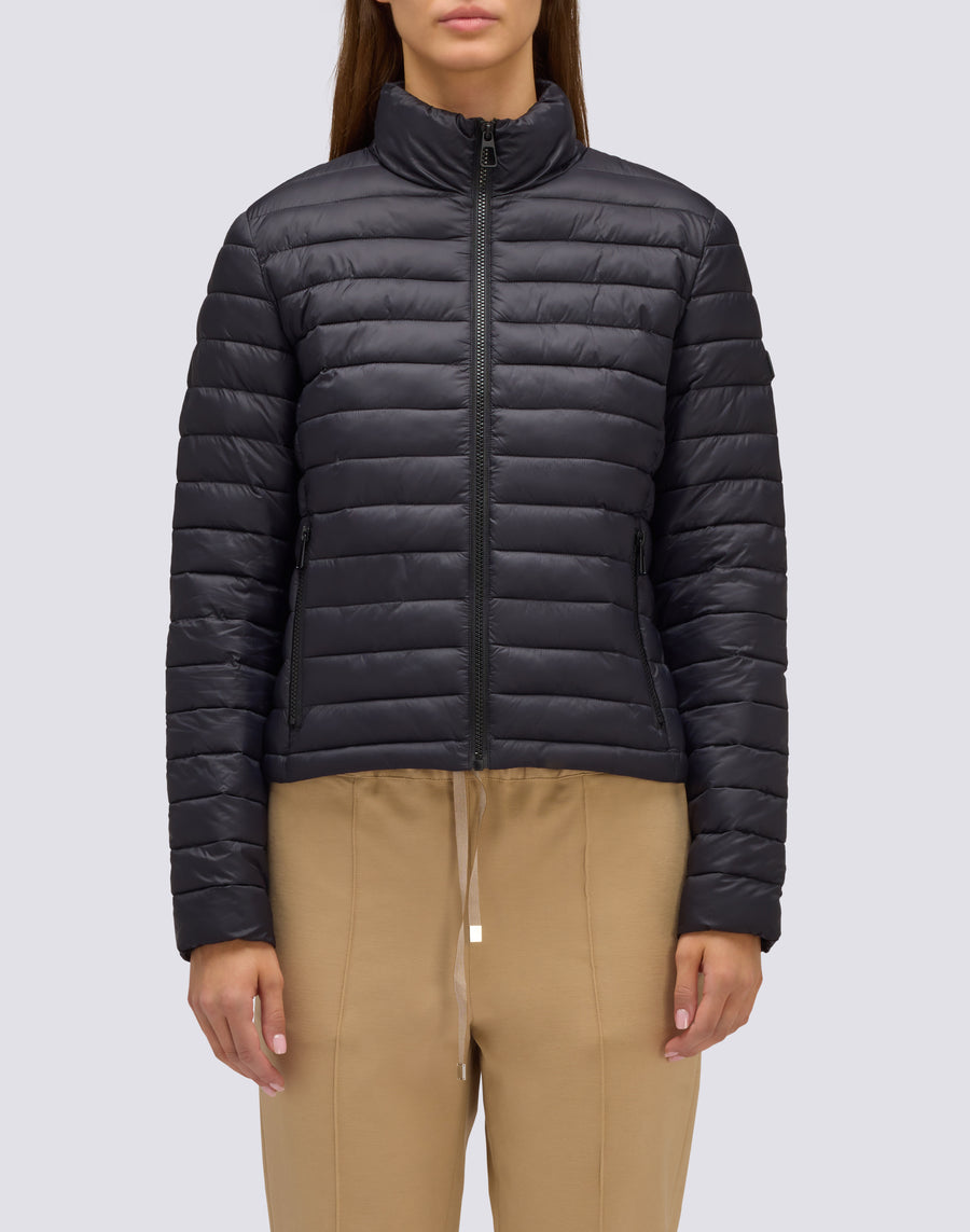 Chaqueta corta de plumón para mujer con cuello alto, confeccionada en tejido de nailon mate superligero y acolchada con canales horizontales. El relleno está fabricado con una innovadora fibra sintética Repreve, que aporta ligereza y protección contra el frío. La prenda se completa con un embalaje de nailon con el logotipo y cordón ajustable. Corte regular y grado de calor medio.