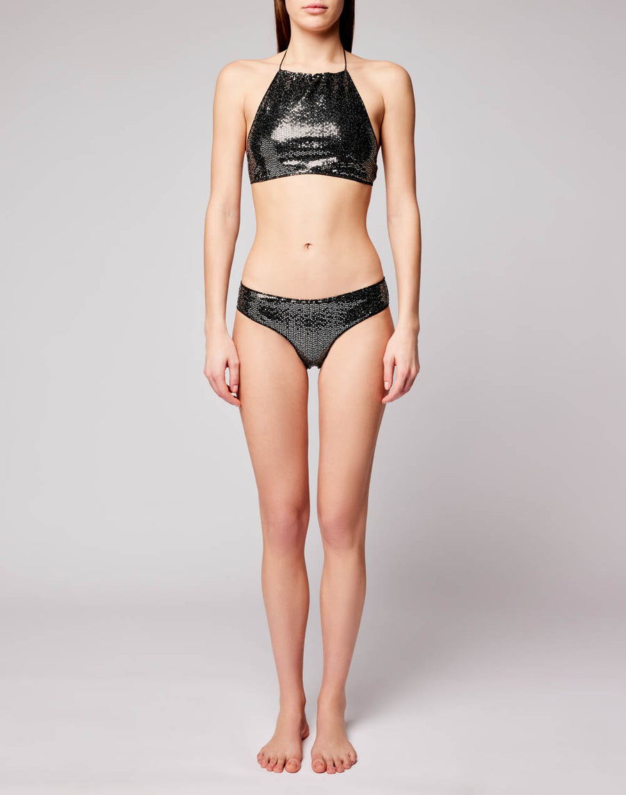 Da un toque glamoroso a tu aspecto de playa con este cuello alto en bikini con un corte trasero y cubierto con lentejuelas. Ser usado con un resumen coordinado o incluso debajo de una camisa o Kaftano. Para aquellos que no quieren pasar desapercibidos y n