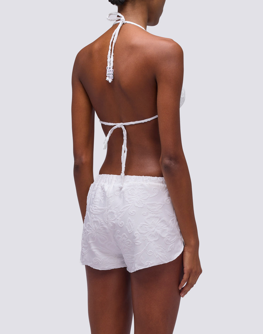 Pantalón corto de rizo jacquard para mujer con estampado SK23. Con cintura elástica y cordón de ajuste, son perfectos para llevar sobre el bikini estampado a juego.