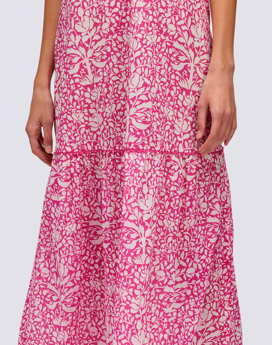 Elegante vestido largo para mujer con tirantes ajustables y detalle de ribetes. El estampado floral le da un toque romántico. Perfecto para un look refinado y sofisticado.