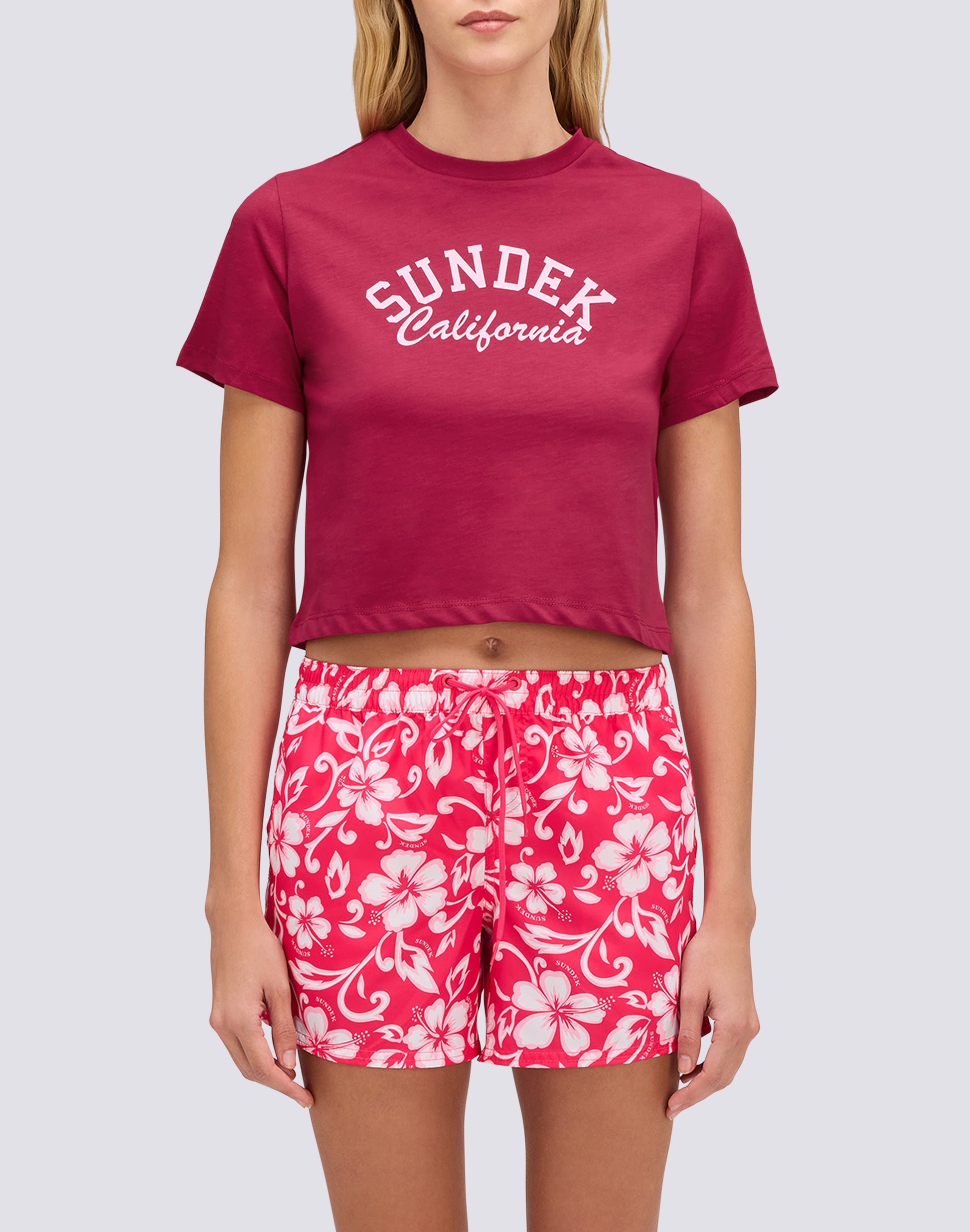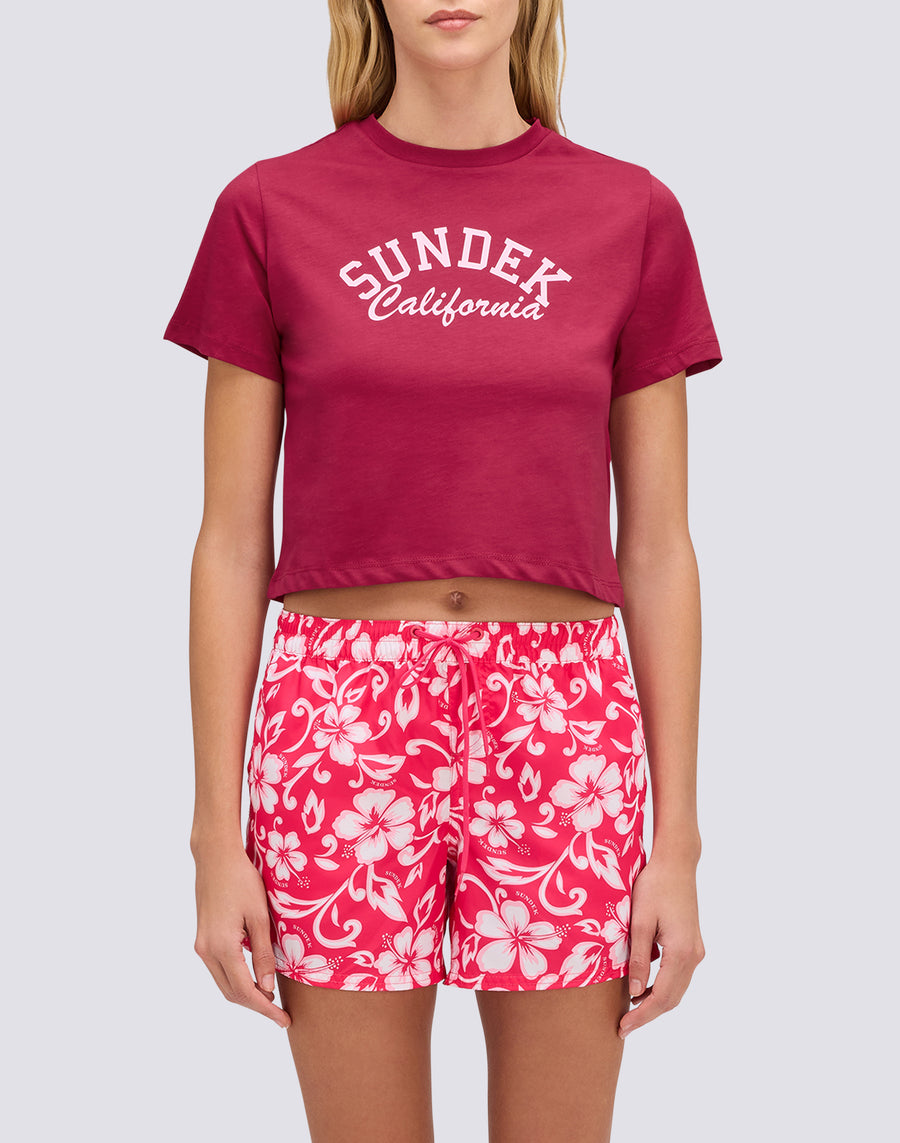 Camiseta de mujer de algodón con corte corto y lavado vintage que le da un aspecto atemporal. El logotipo SUNDEK CALIFORNIA estampado en la parte delantera representa la identidad de la marca y añade carácter a la prenda. Perfecta para quienes aman un estilo casual pero cuidado, para llevar sola con unos pantalones cortos o combinada con otras prendas de la colección. Una prenda básica y versátil que captura el alma de la cultura playera californiana.