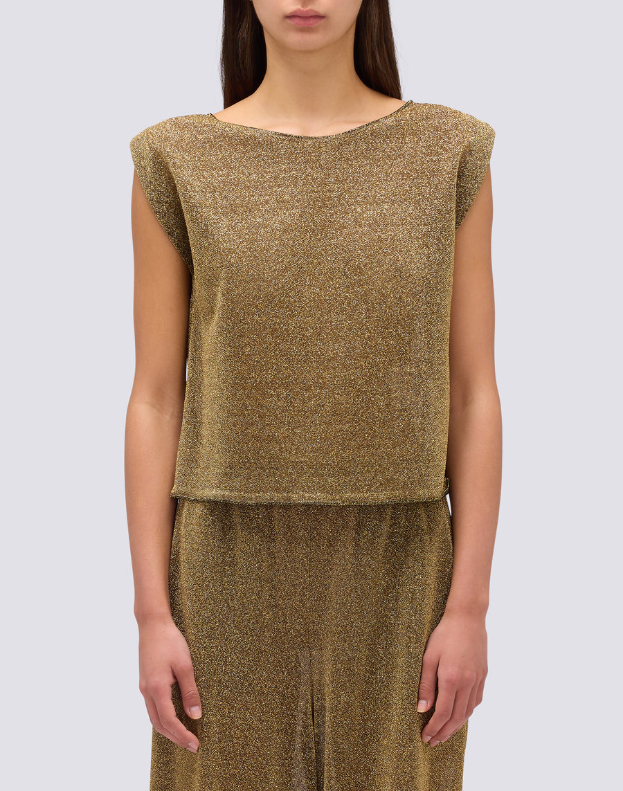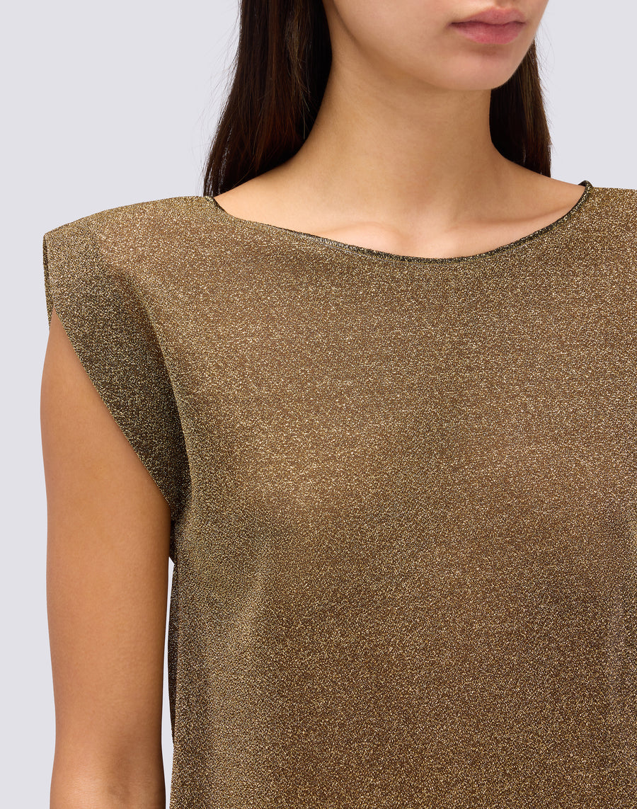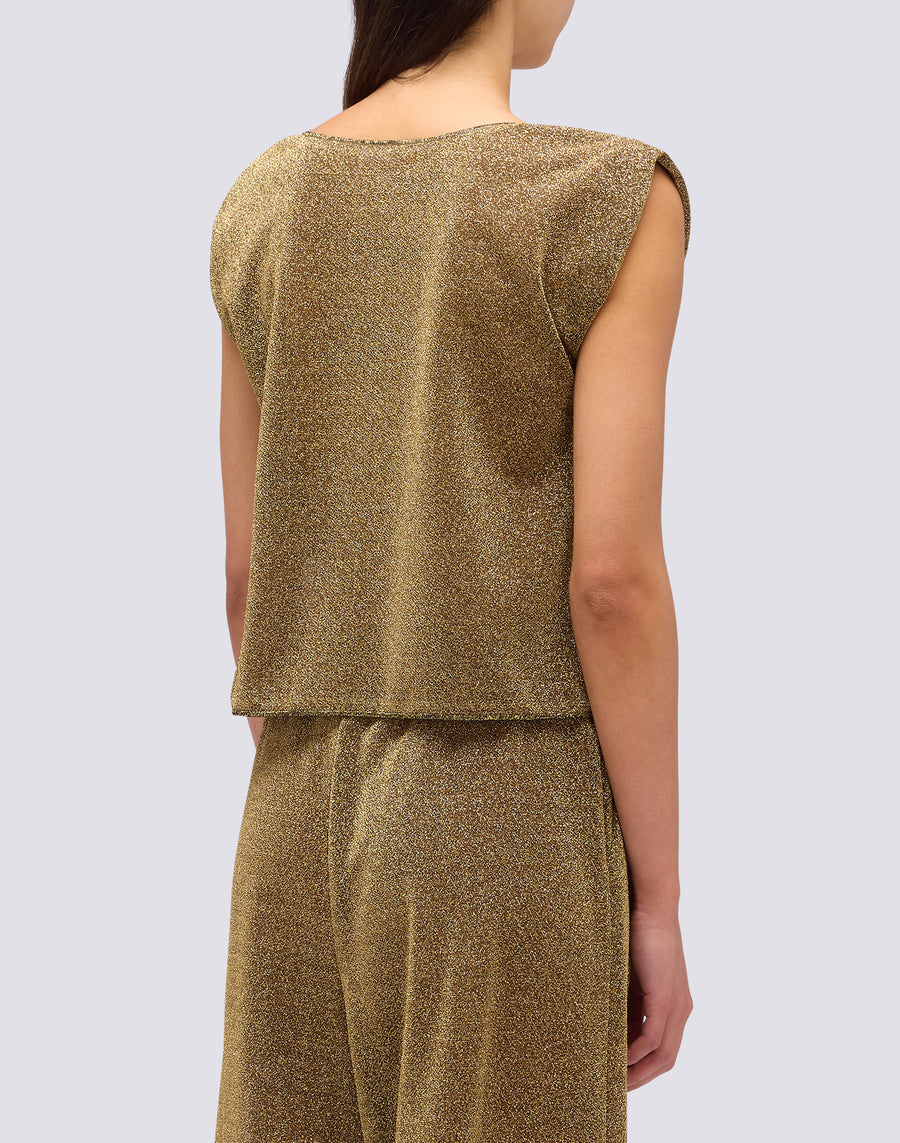 Esta camiseta de mujer en lúrex es perfecta para crear looks brillantes. Combínala con unos shorts o unos pantalones a juego y añade un toque de glamour a tu estilo. Está confeccionada en un tejido suave y es cómoda de llevar durante todo el día.