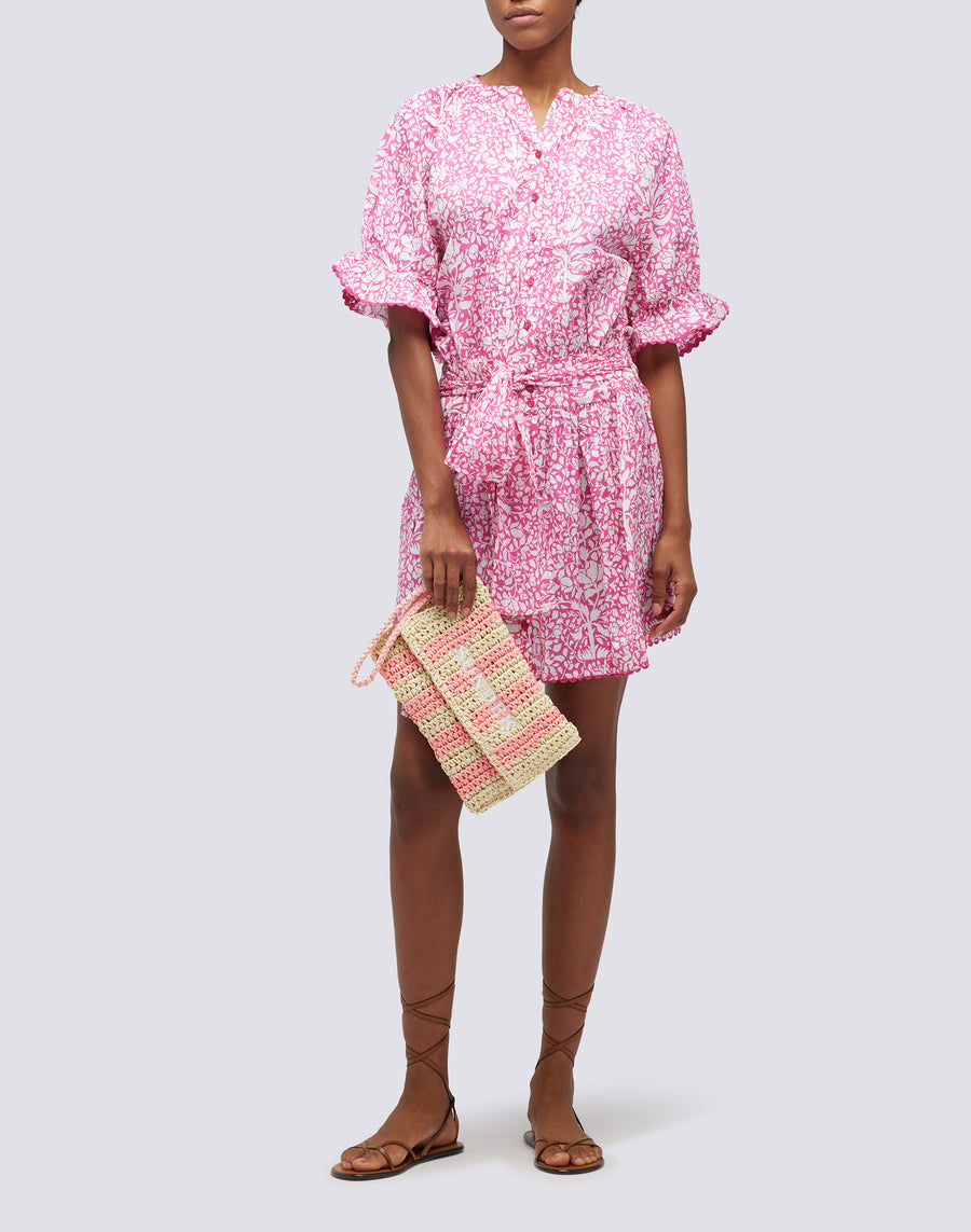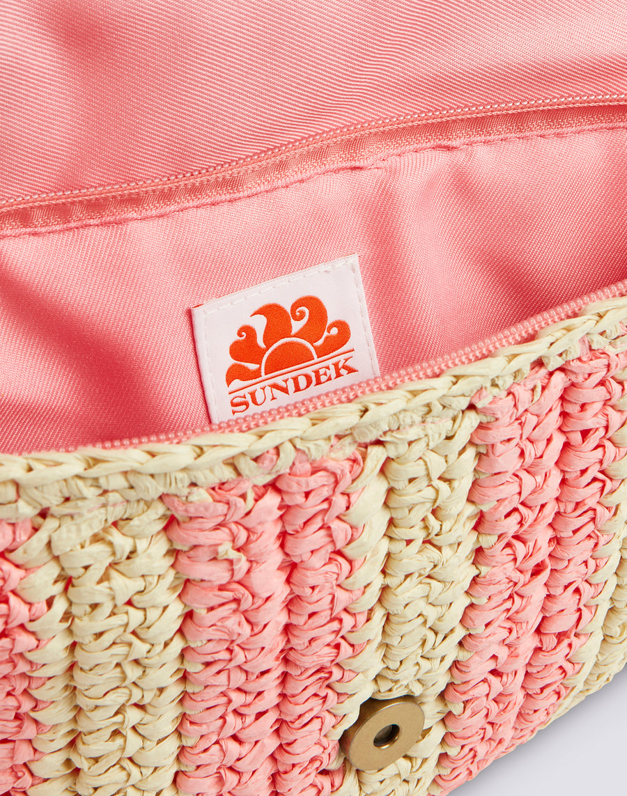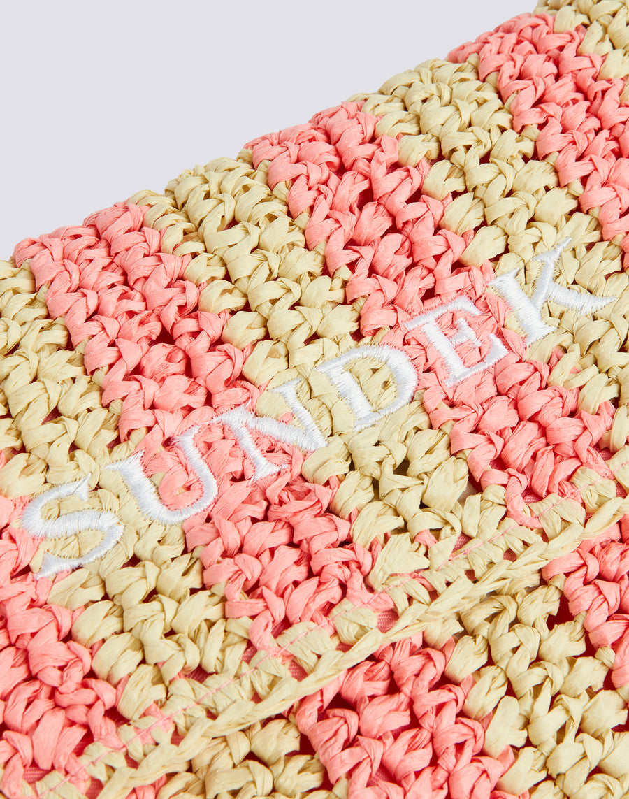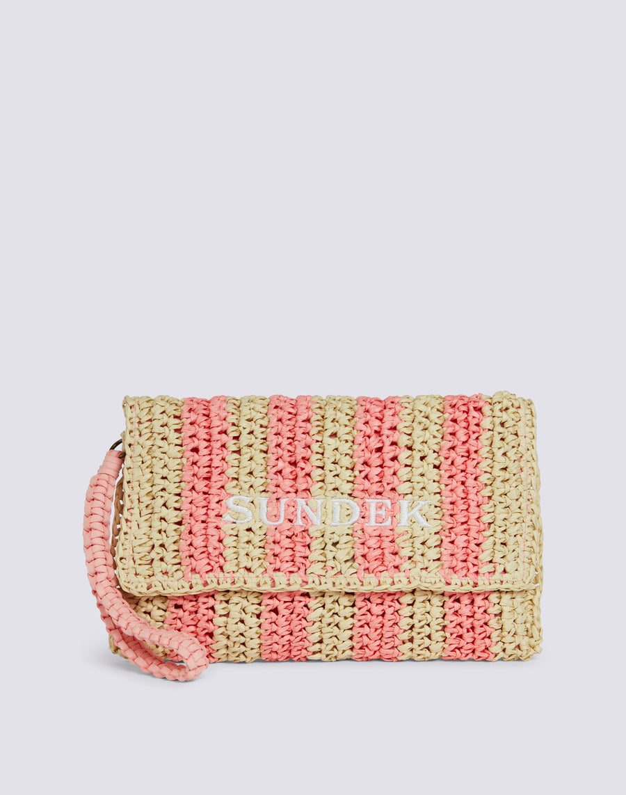 Pochette Izumi en papier effet paille à motif rayé. Equipé d'une dragonne, il est pratique à transporter grâce à sa petite taille. Le motif rayé le rend vivant et original.