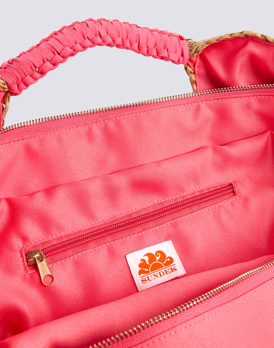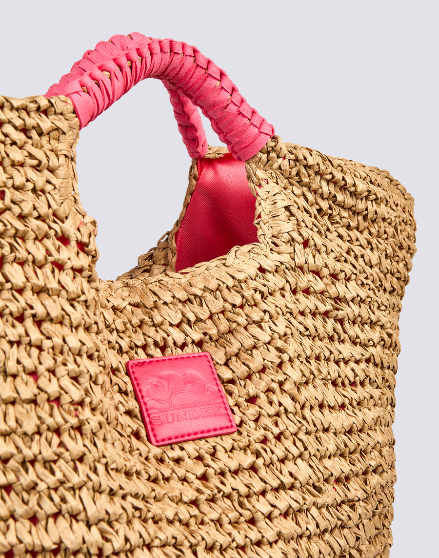 Sac shopping en papier effet paille avec poignées contrastées. Spacieux, équipé d'une fermeture zippée centrale, il est idéal pour une promenade ou comme sac de plage.