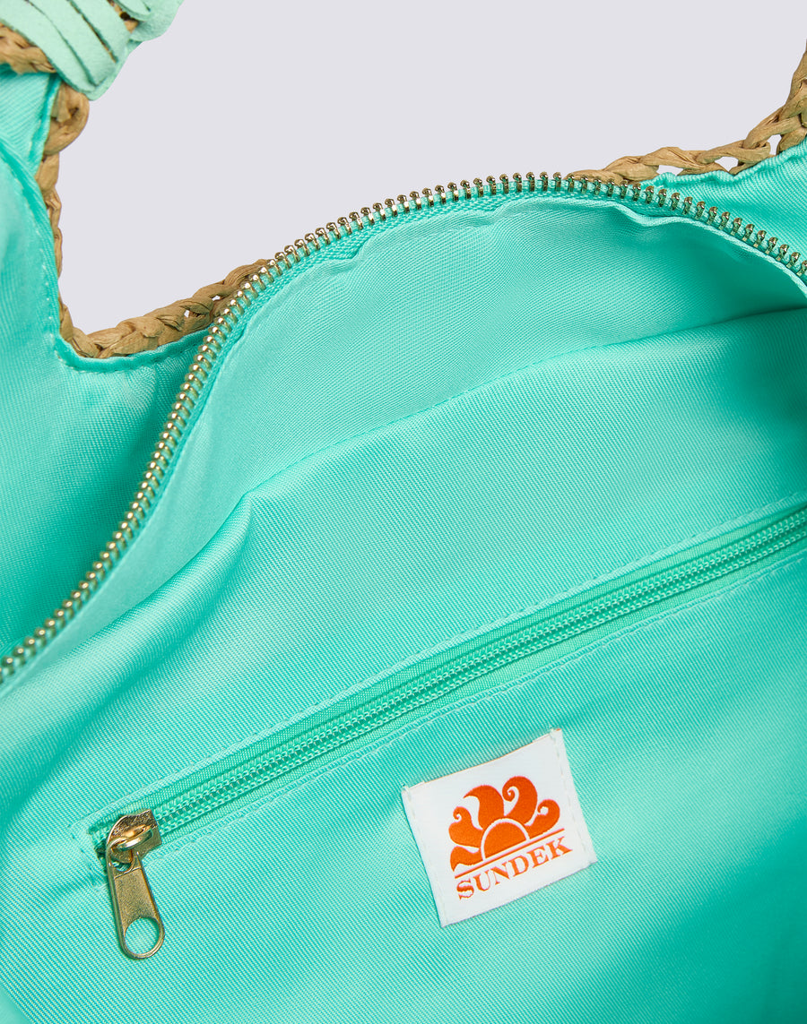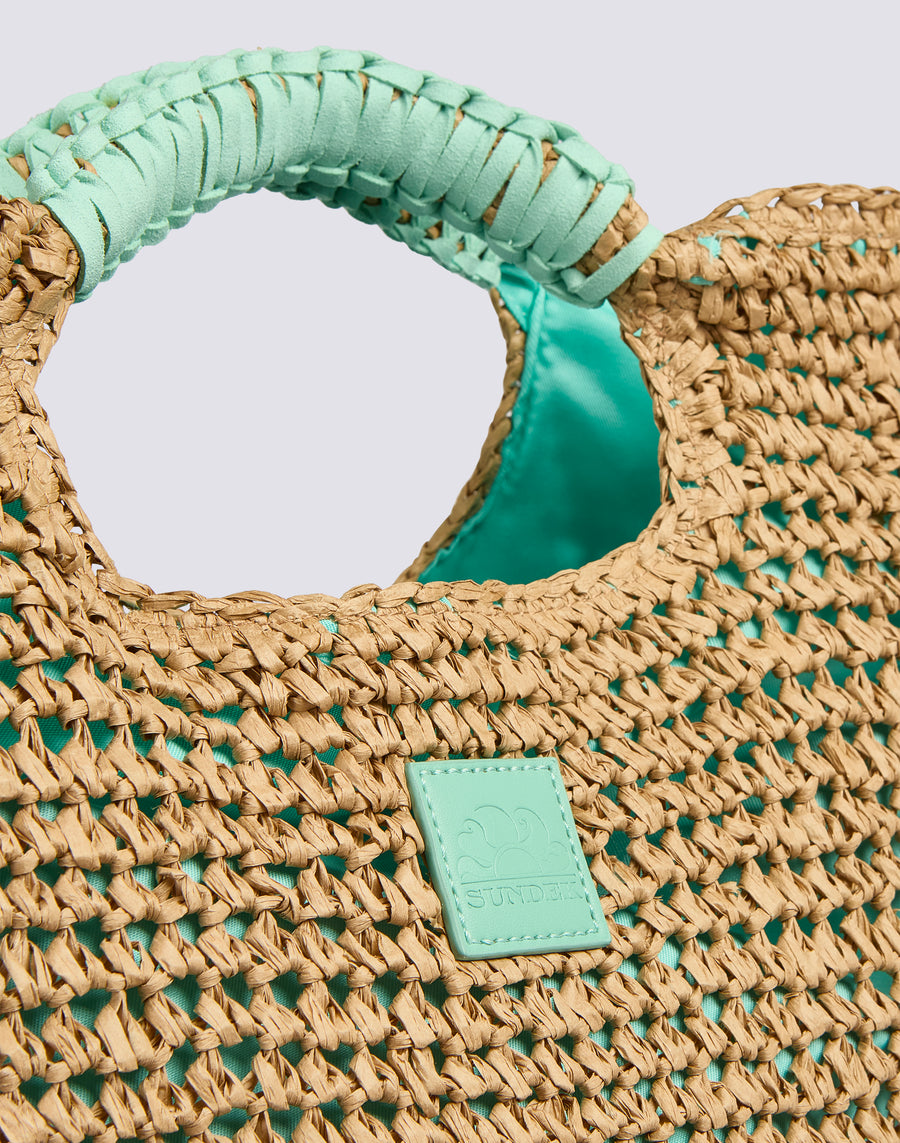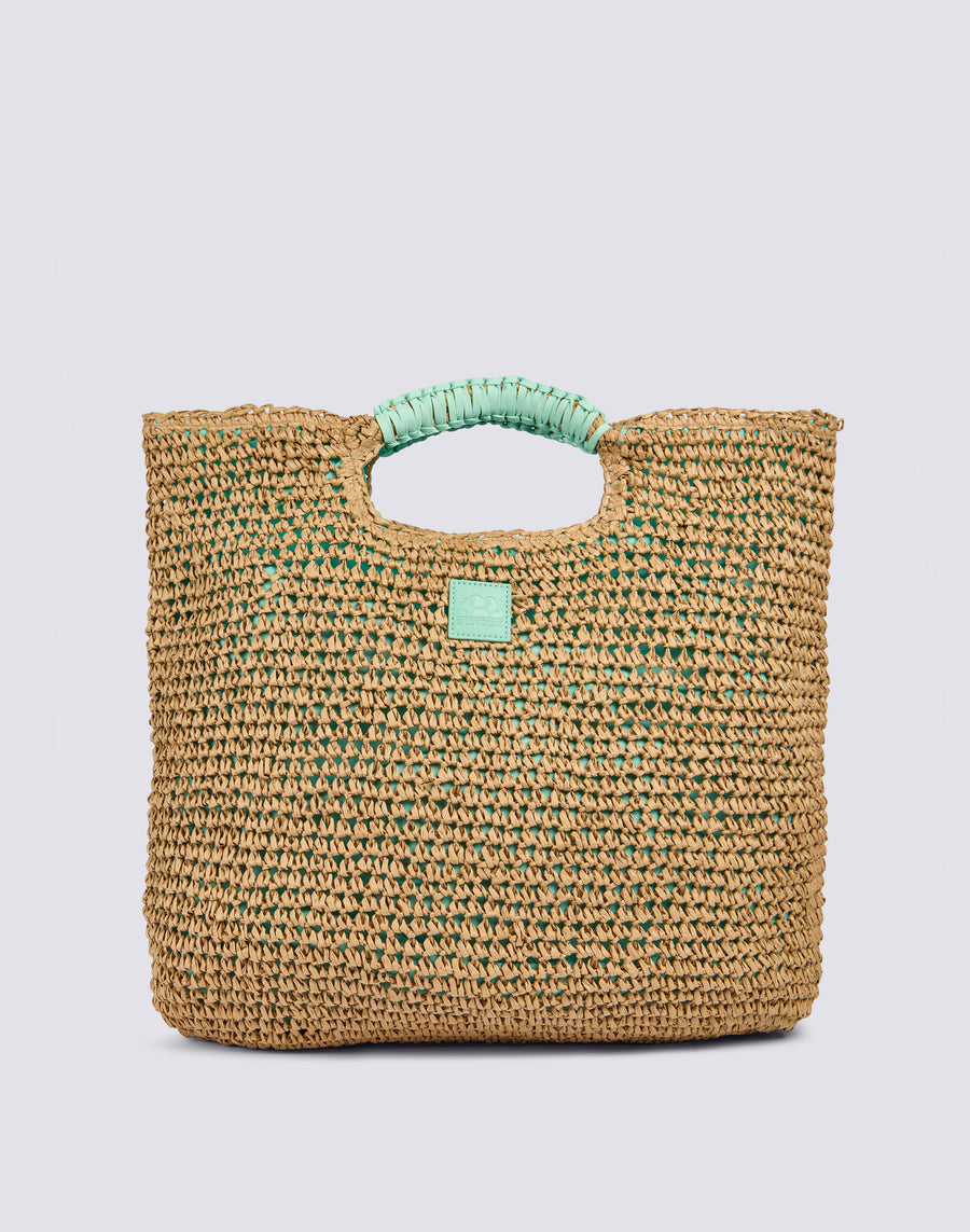 Sac shopping en papier effet paille avec poignées contrastées. Spacieux, équipé d'une fermeture zippée centrale, il est idéal pour une promenade ou comme sac de plage.