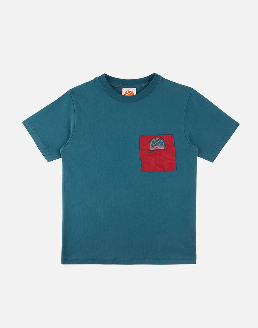 T-shirt garçon bicolore avec poche poitrine contrastée. Manches courtes, col rond, en coton doux.