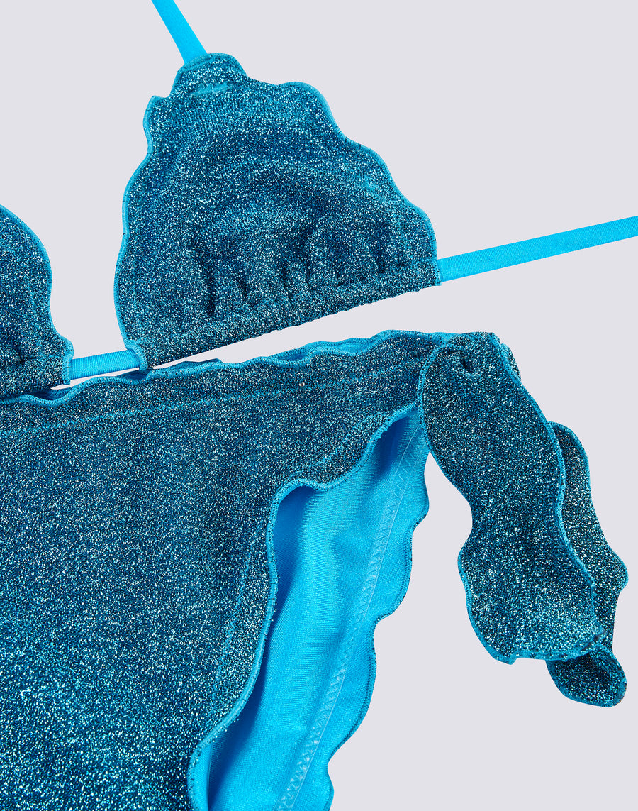 Haut triangle avec volants et lacets réglables derrière la nuque et dans le dos, culotte avec nœuds latéraux réglables et volants. Modèle en lurex pouvant être porté en coordination avec le bikini femme, dans les mêmes déclinaisons de couleurs.