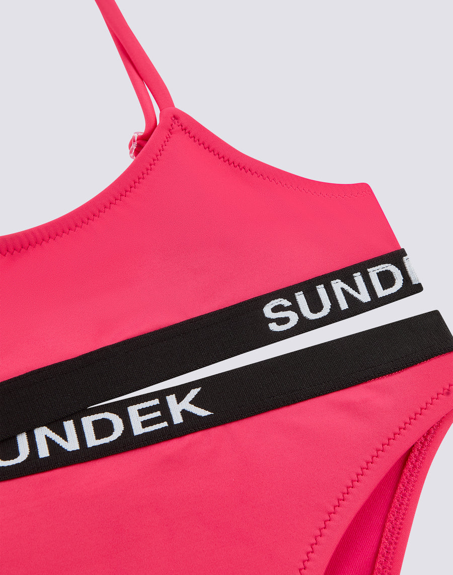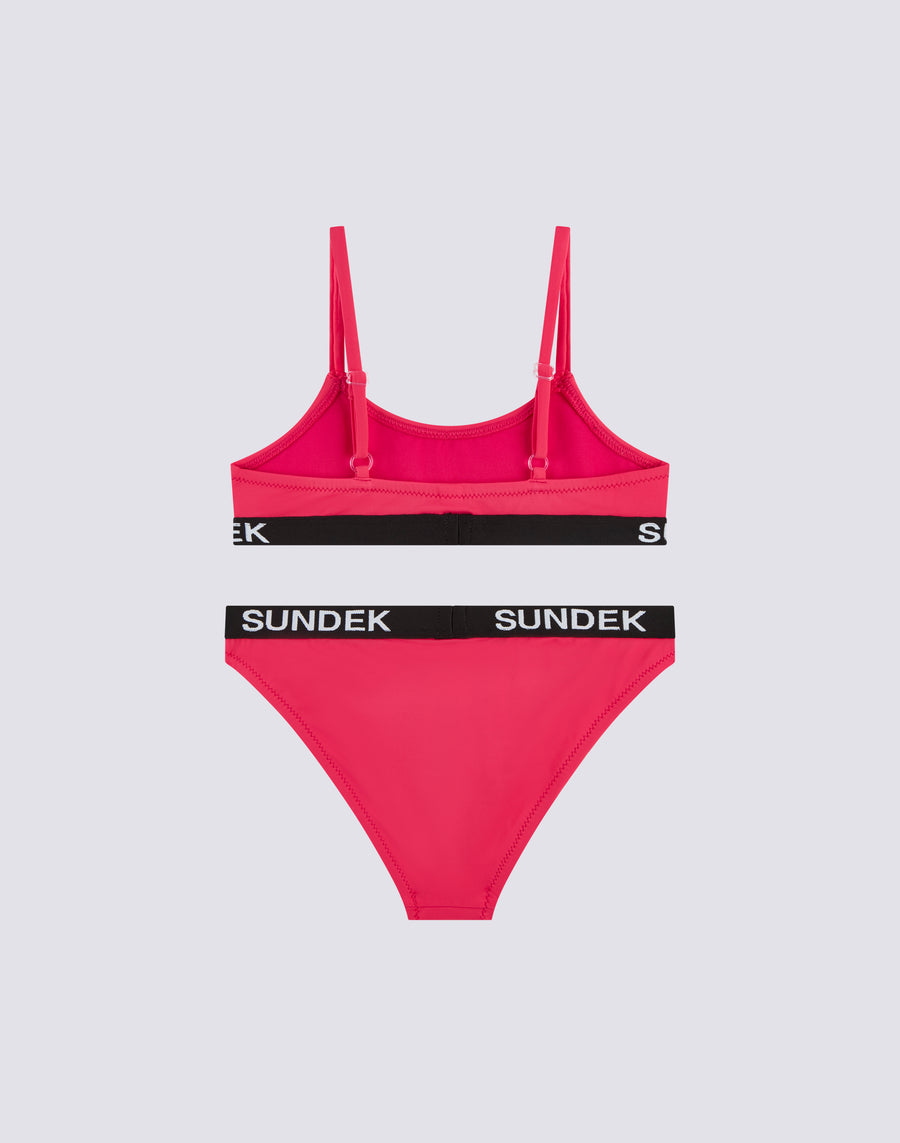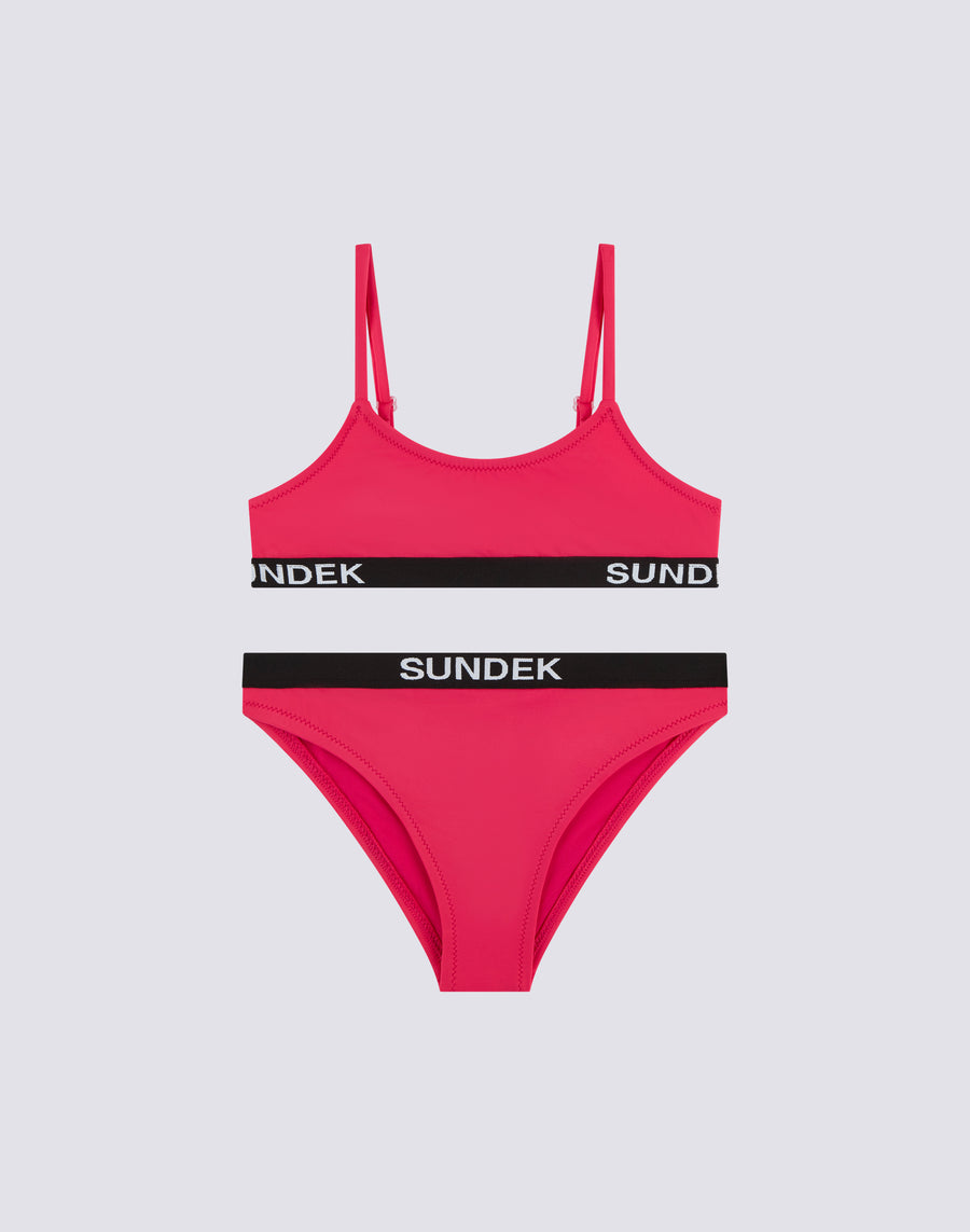 Choisissez pour votre petite fille ce bikini composé d'un haut bandeau et d'une culotte élastiquée, personnalisé avec un logo contrasté. Le tissu écologique, doux et résistant, est adapté à mille baignades et jeux sur la plage.