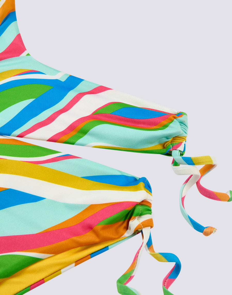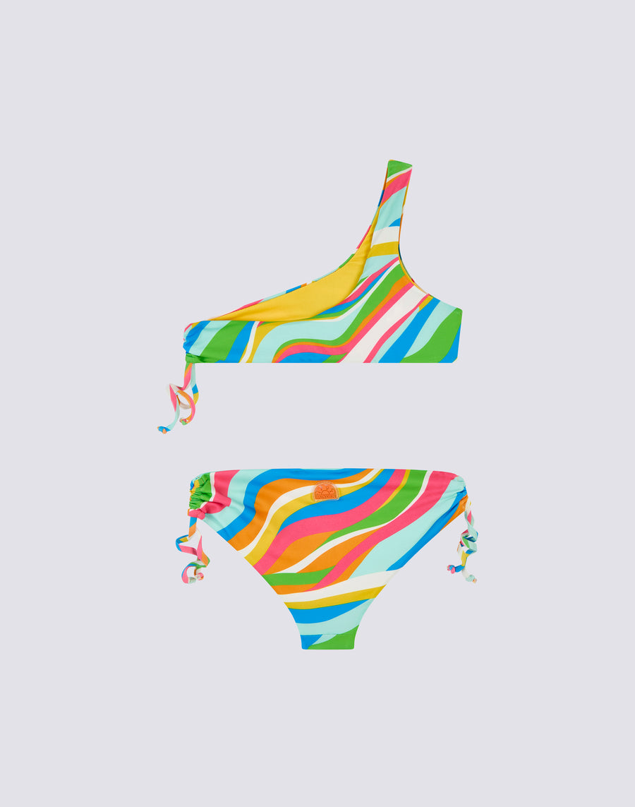 Bikini fille avec motif multicolore, composé d'un haut à une épaule et d'un slip fixe avec cordon de serrage sur les côtés.