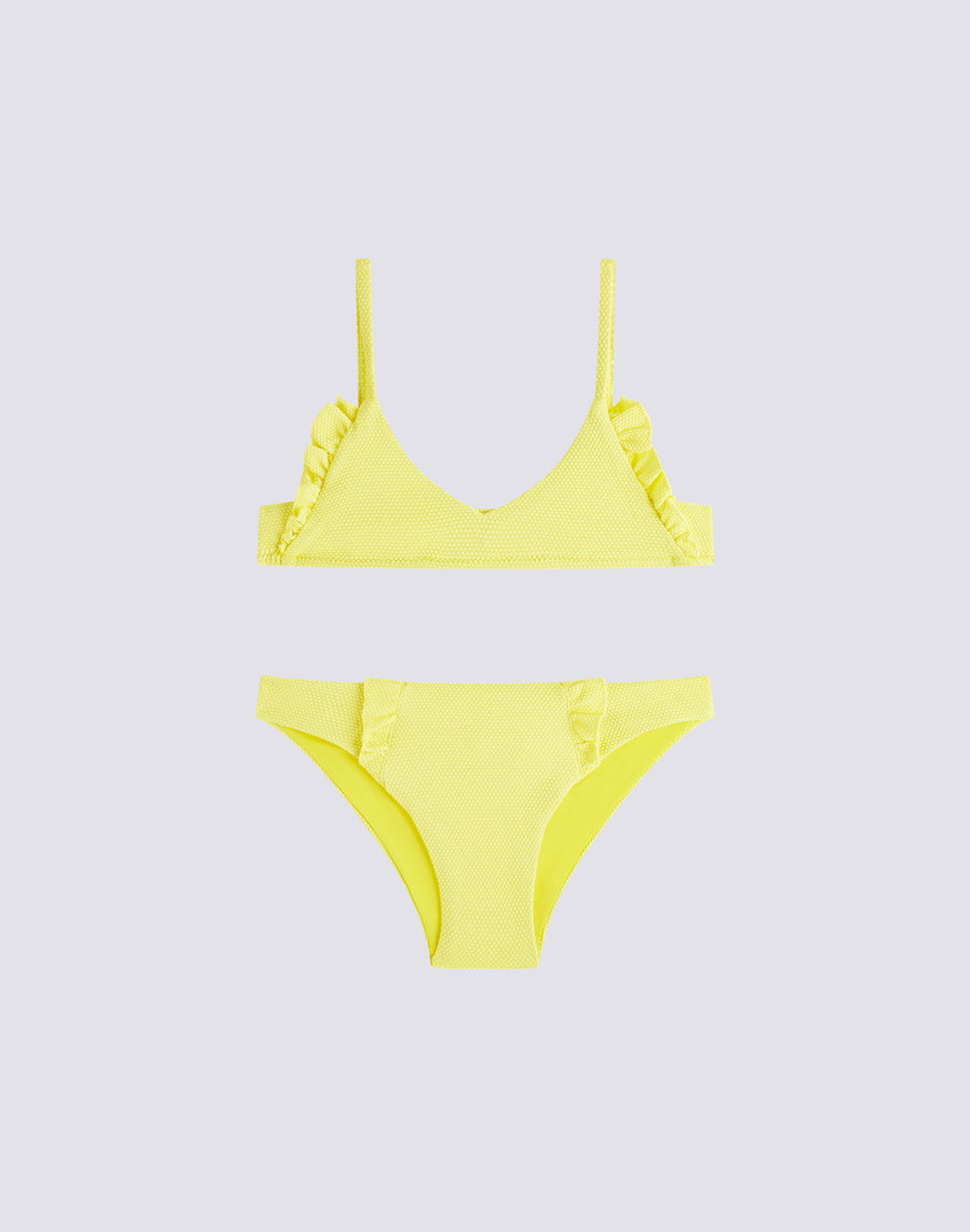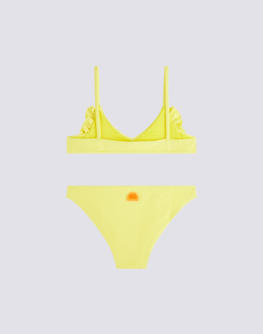 Bikini pour fille composé d'un haut et d'un bas, tous deux caractérisés par des volants. Les bretelles du haut sont réglables, tandis que le bas a une taille fixe.