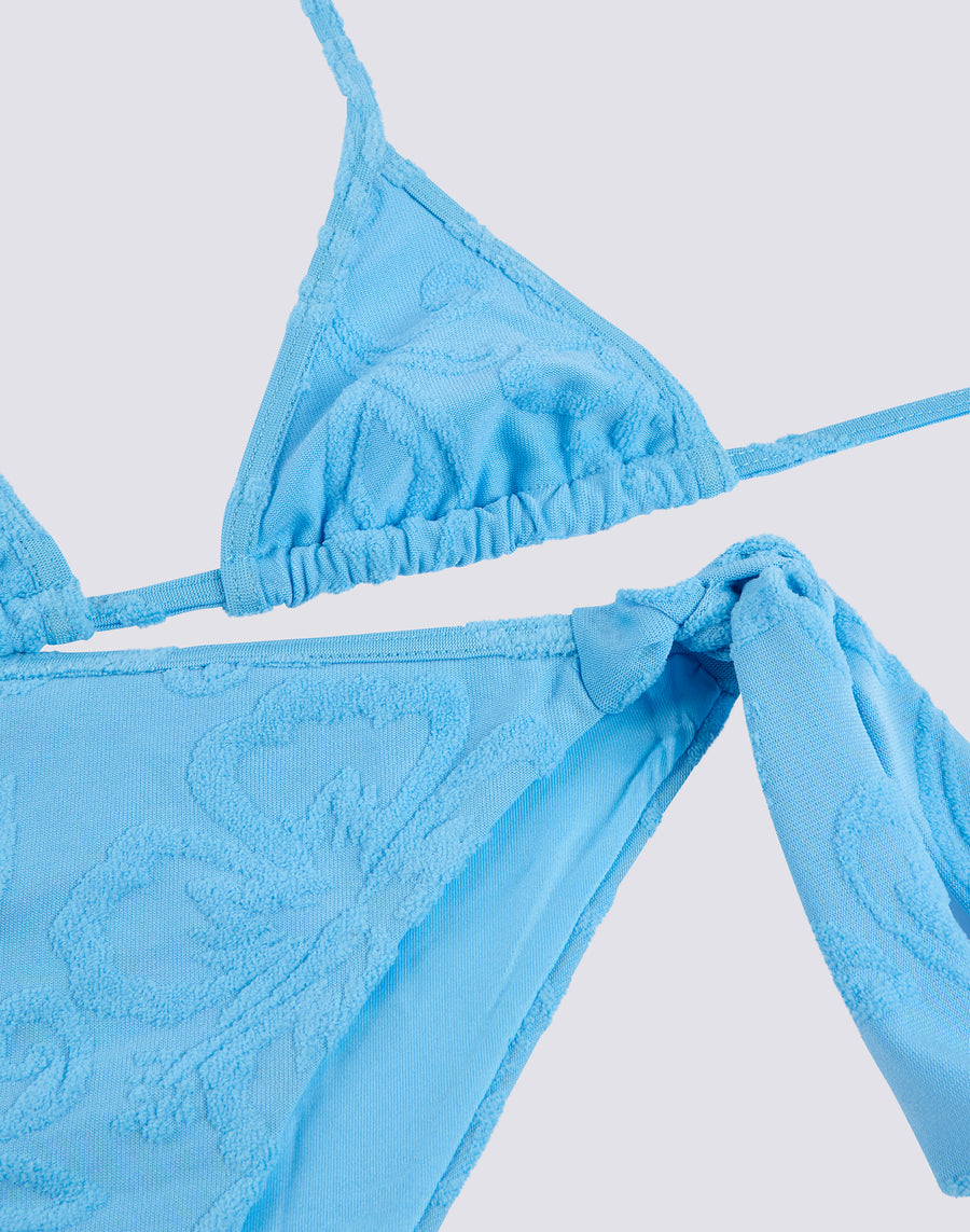 Mini bikini en éponge jacquard avec motif SK23 composé d'un triangle avec des lacets réglables et d'un slip avec des nœuds, également réglables.