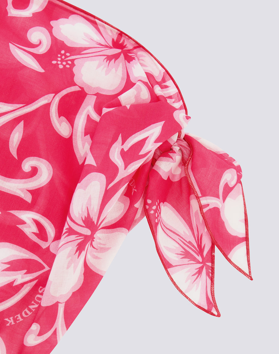 Pareo court pour fille en voile de coton avec imprimé SK23 et fermeture à nœud sur le devant.