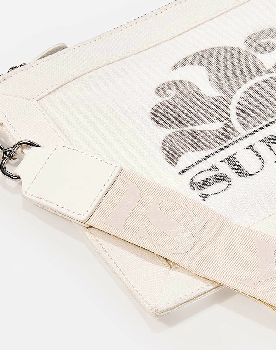 Pochette clutch en mesh avec sequins et logo Sundek brodé. Parfaite aussi bien comme trousse de toilette que comme pochette. Lanière amovible avec logo Sundek. Dimensions: 27 x 20.5cm