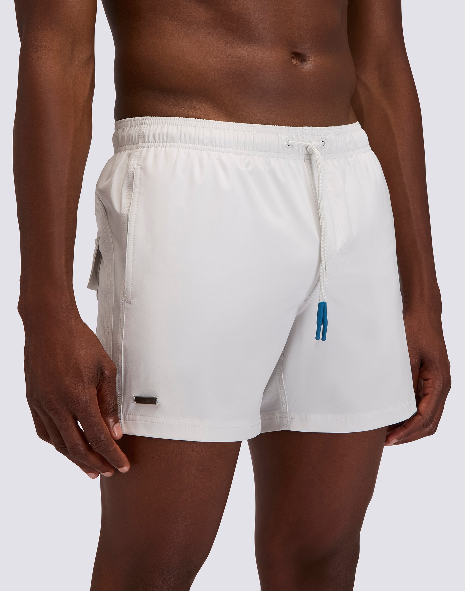 86 % polyester, 14 % élasthanne – Tissu extensible dans les 4 sens. Léger et confortable, ce tissu en polyester extensible offre une liberté de mouvement optimale, est déperlant et sèche rapidement. Idéal pour la plage et les activités sportives.