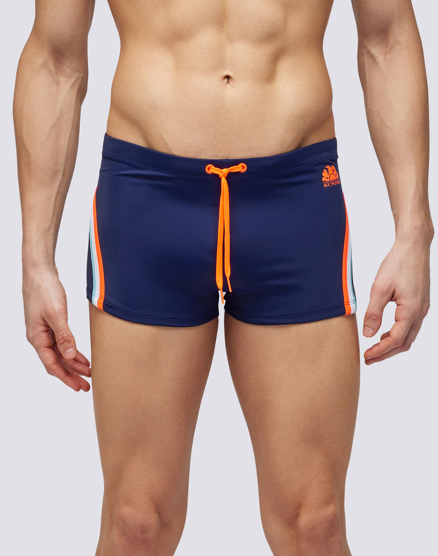 Boxer de bain pour homme à taille ajustable avec cordon de serrage et cordon de serrage contrasté : c'est un modèle intemporel en phase avec son temps car il est éco-durable grâce au tissu régénéré ECONYL® Made in Italy. Vous pouvez le porter aussi bien pour nager que pour bronzer et bronzer. Longueur de jambe extérieure 9"/23cm (en taille M).