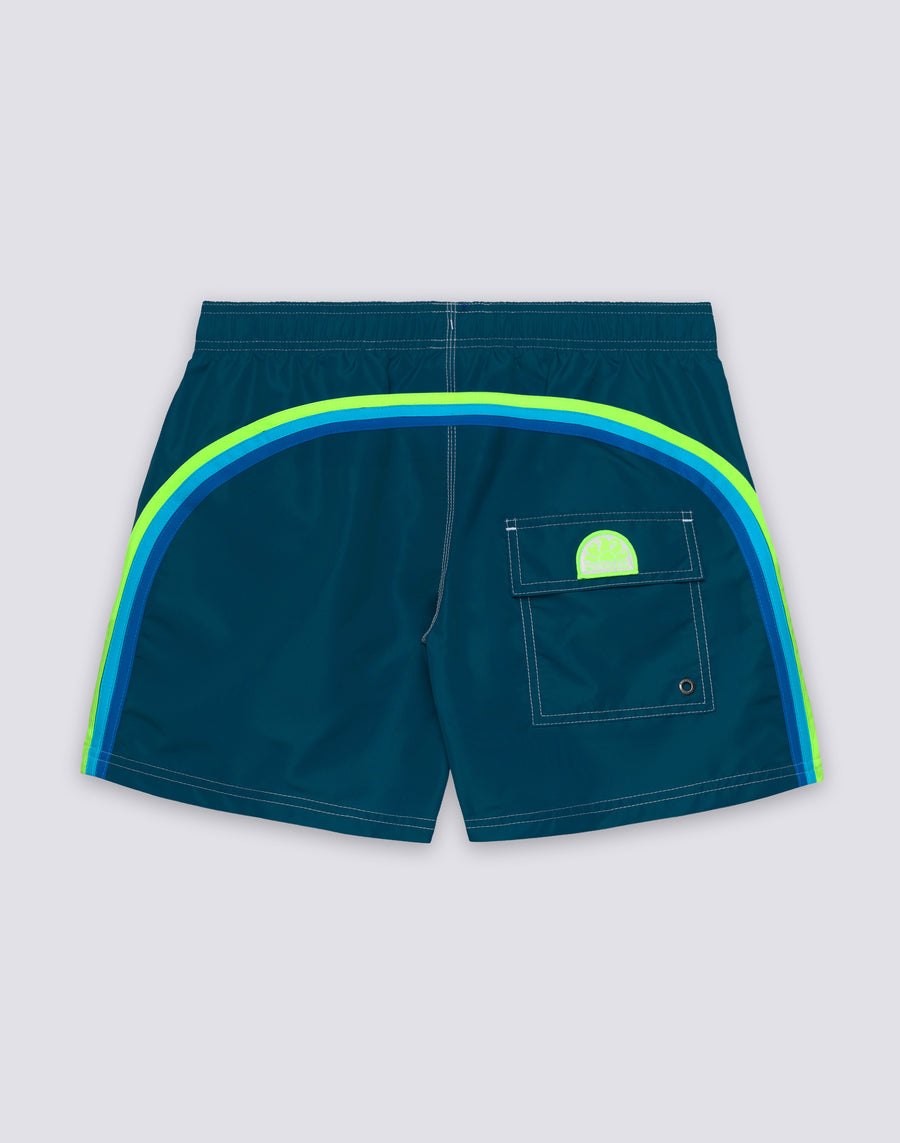 Arborant l'emblématique arc-en-ciel Sundek au dos, symbole d'authenticité et d'héritage de la marque, ce short de bain est doté d'une taille élastiquée avec cordon de serrage ajustable pour un confort personnalisé. Ses coutures triples garantissent une résistance et une durabilité maximales, même après d'innombrables sessions de surf, de natation et de bronzage.