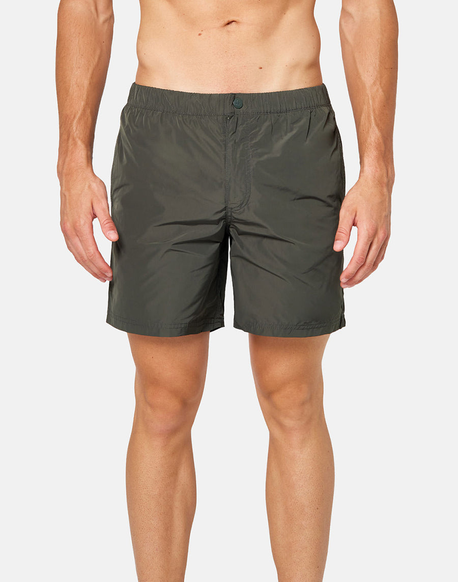 Maillot de bain homme mi-long avec fermeture à bouton-pression sur le devant, zip thermosoudé pour fermer la poche arrière et arc-en-ciel au dos de la même couleur que le maillot de bain. Léger, résistant, il sèche rapidement et conserve sa forme dans le