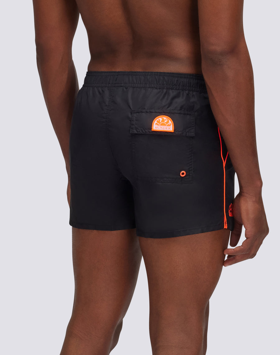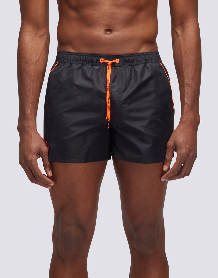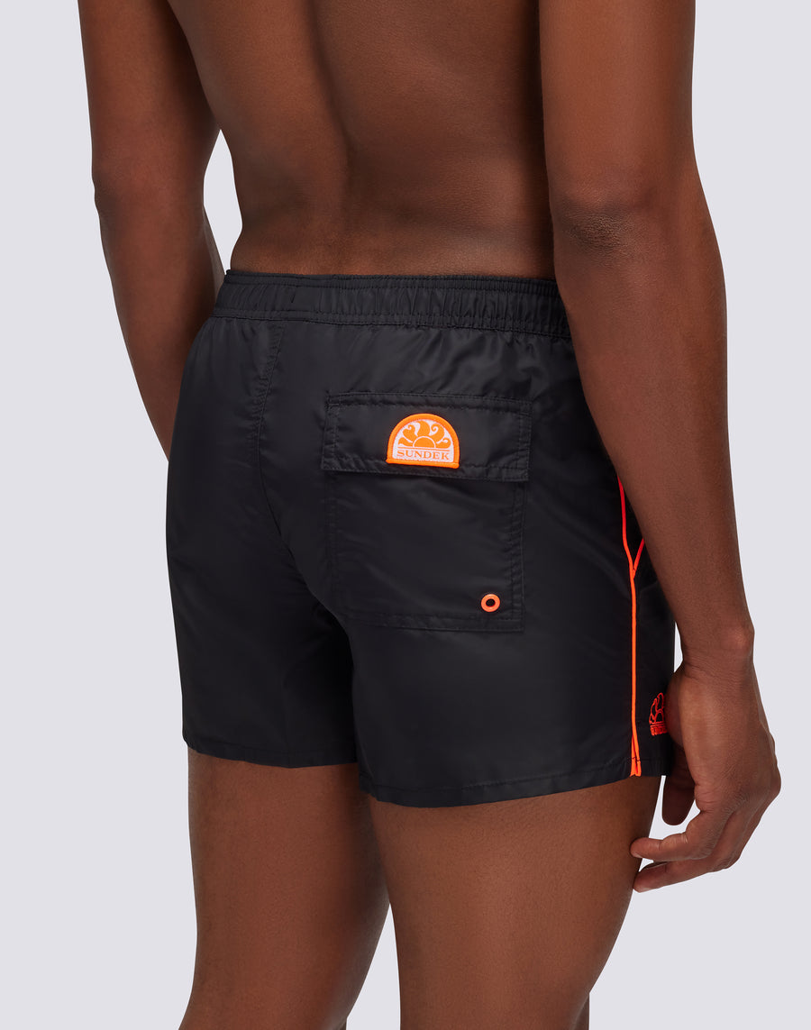 Maillot de bain court Coltrane avec taille élastiquée et passepoil contrasté sur le devant. Le costume dispose d'un cordon de serrage et d'une poche arrière avec fermeture velcro, ainsi que de triples coutures sur les zones les plus sollicitées pour assurer une résistance optimale. Longueur à l'extérieur de la jambe 13"/33 cm (en taille M).