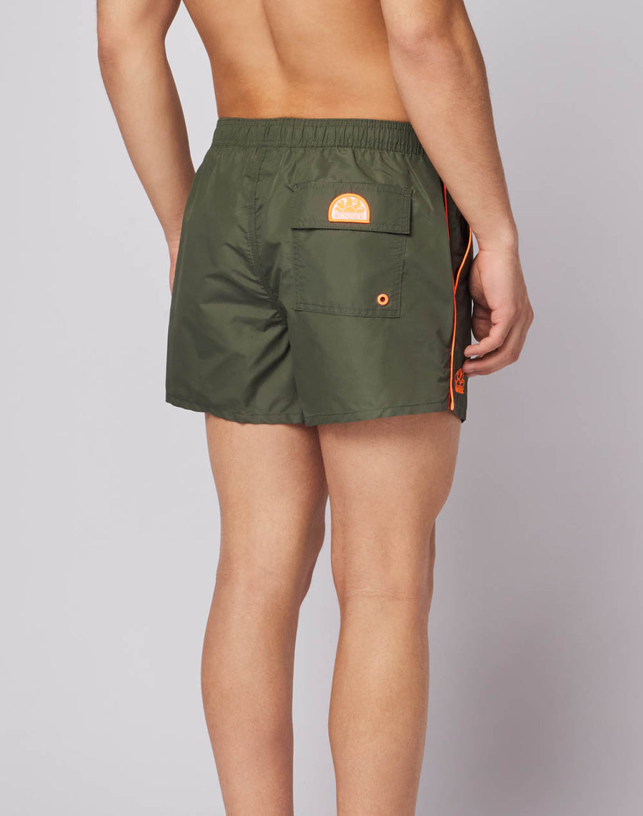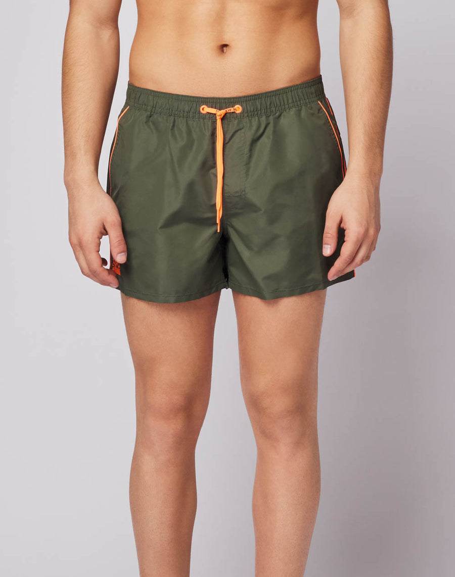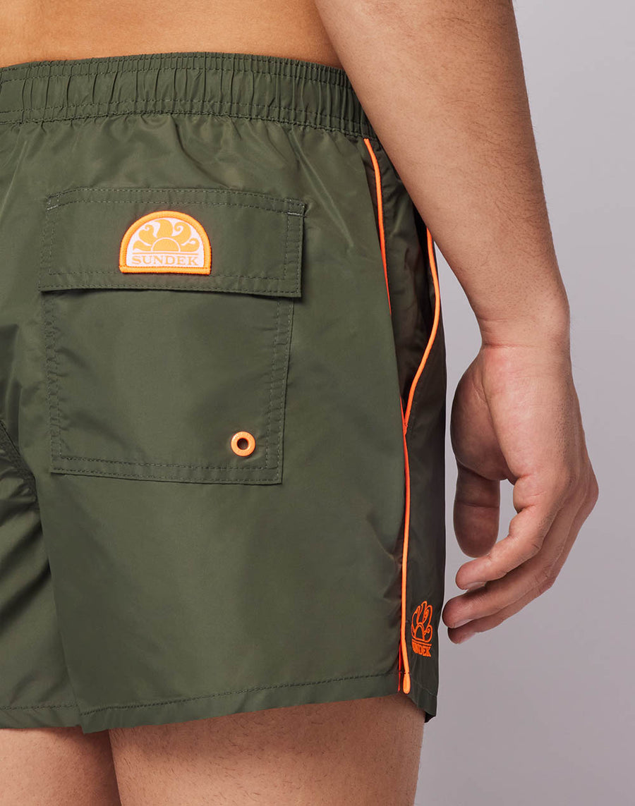 Maillot de bain court Coltrane avec taille élastiquée et passepoil contrasté sur le devant. Le costume dispose d'un cordon de serrage et d'une poche arrière avec fermeture velcro, ainsi que de triples coutures sur les zones les plus sollicitées pour assurer une résistance optimale. Longueur à l'extérieur de la jambe 13"/33 cm (en taille M).